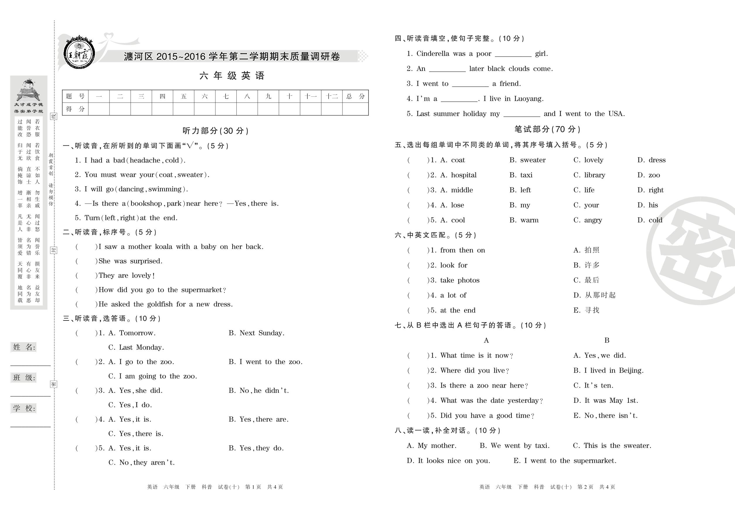 2015-2016学年第二学期洛阳市瀍河区六年级英语试卷(科普版)【10】