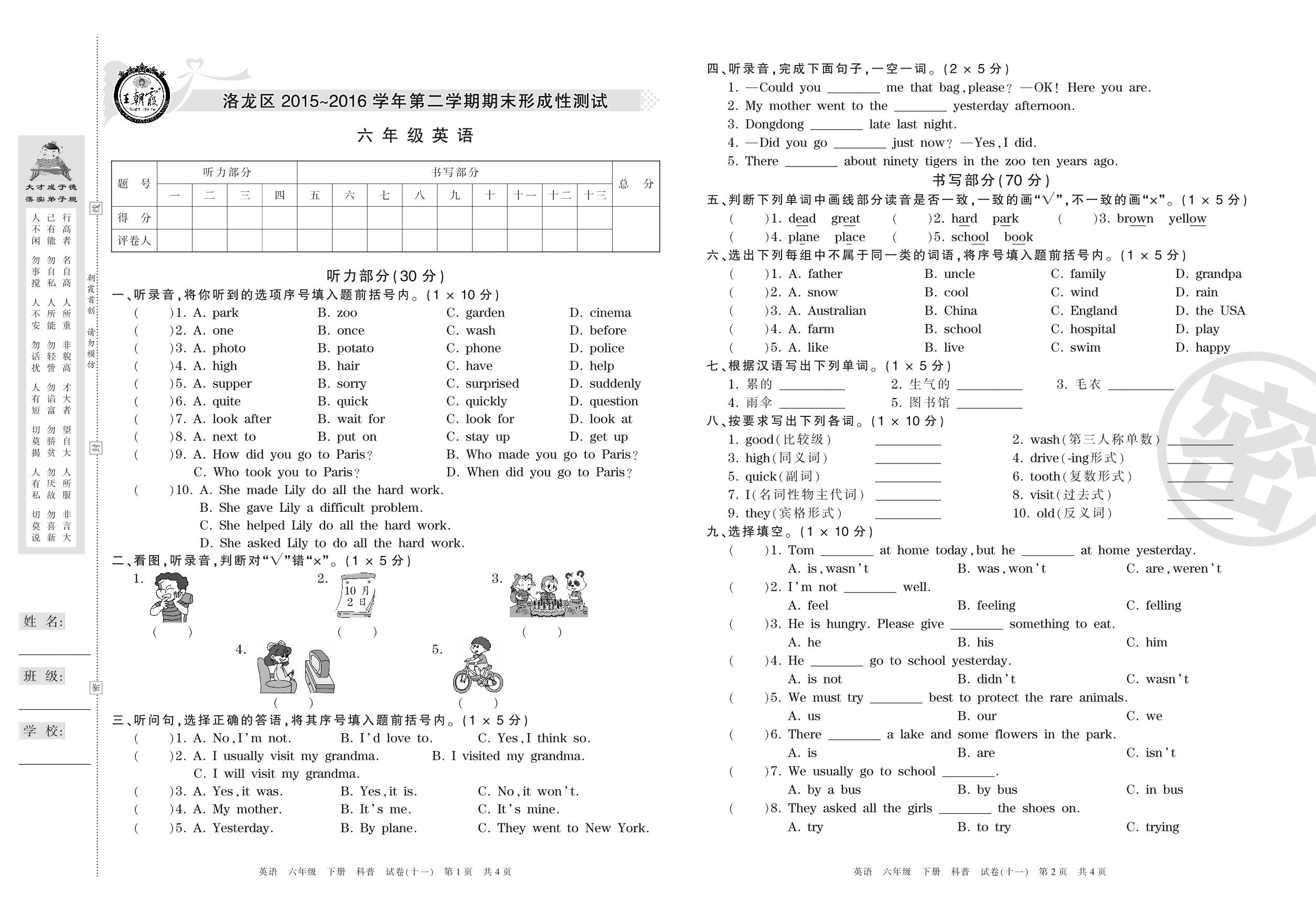 2015-2016学年第二学期洛阳市洛龙区六年级英语试卷(科普版)【11】