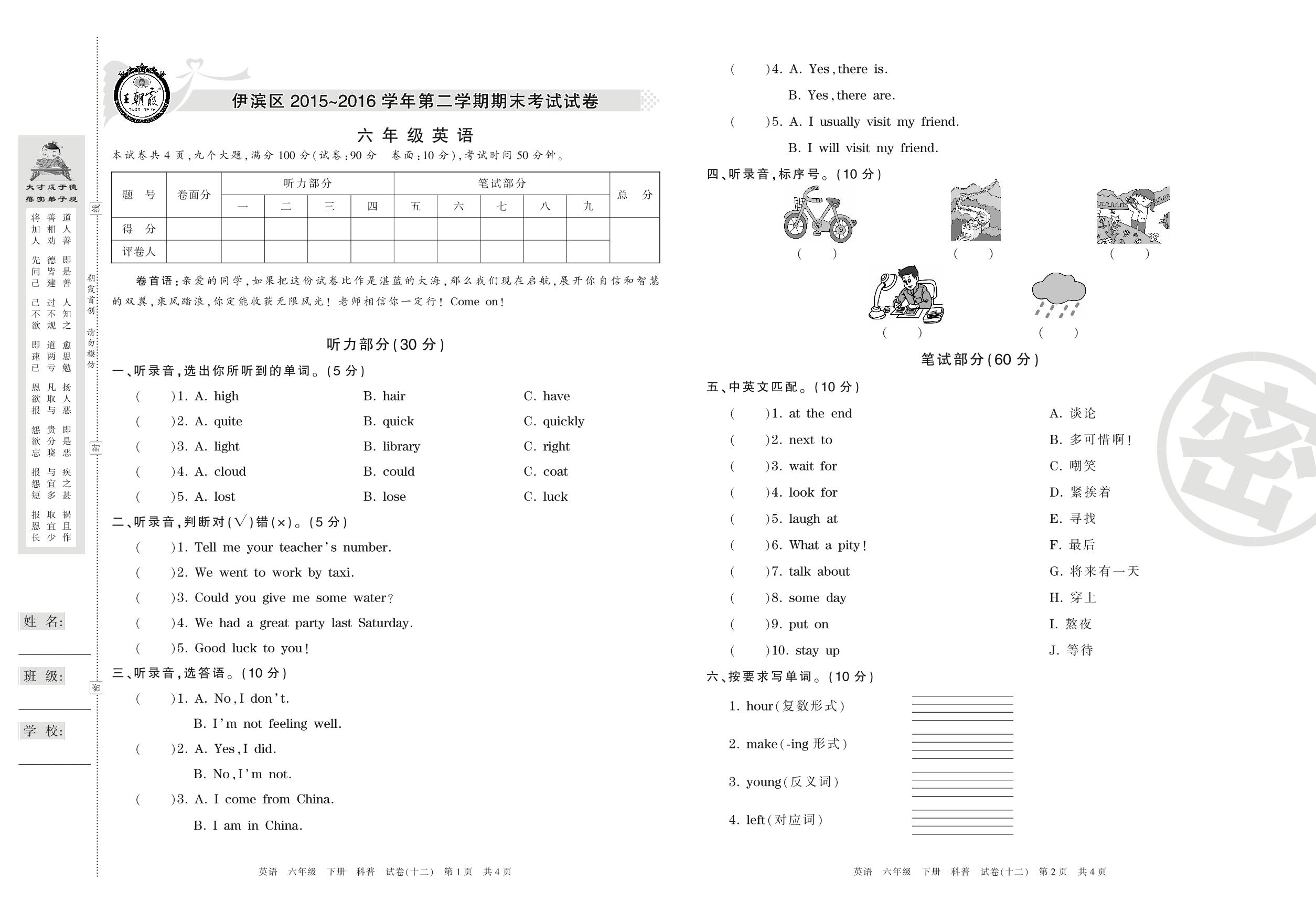 2015-2016学年第二学期洛阳市伊滨区六年级英语试卷(科普版)【12】