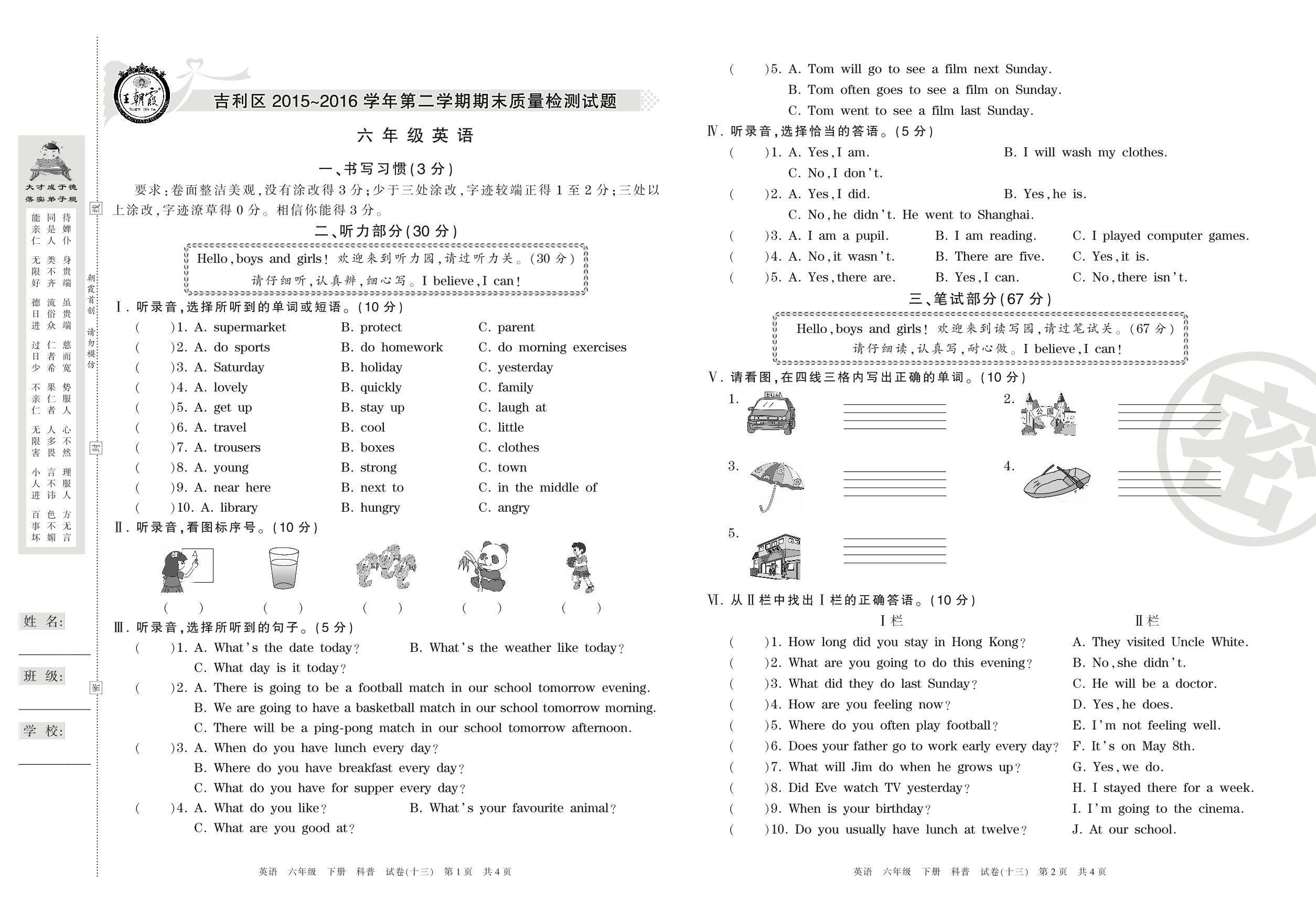 2015-2016学年第二学期洛阳市吉利区六年级英语试卷(科普版)【13】