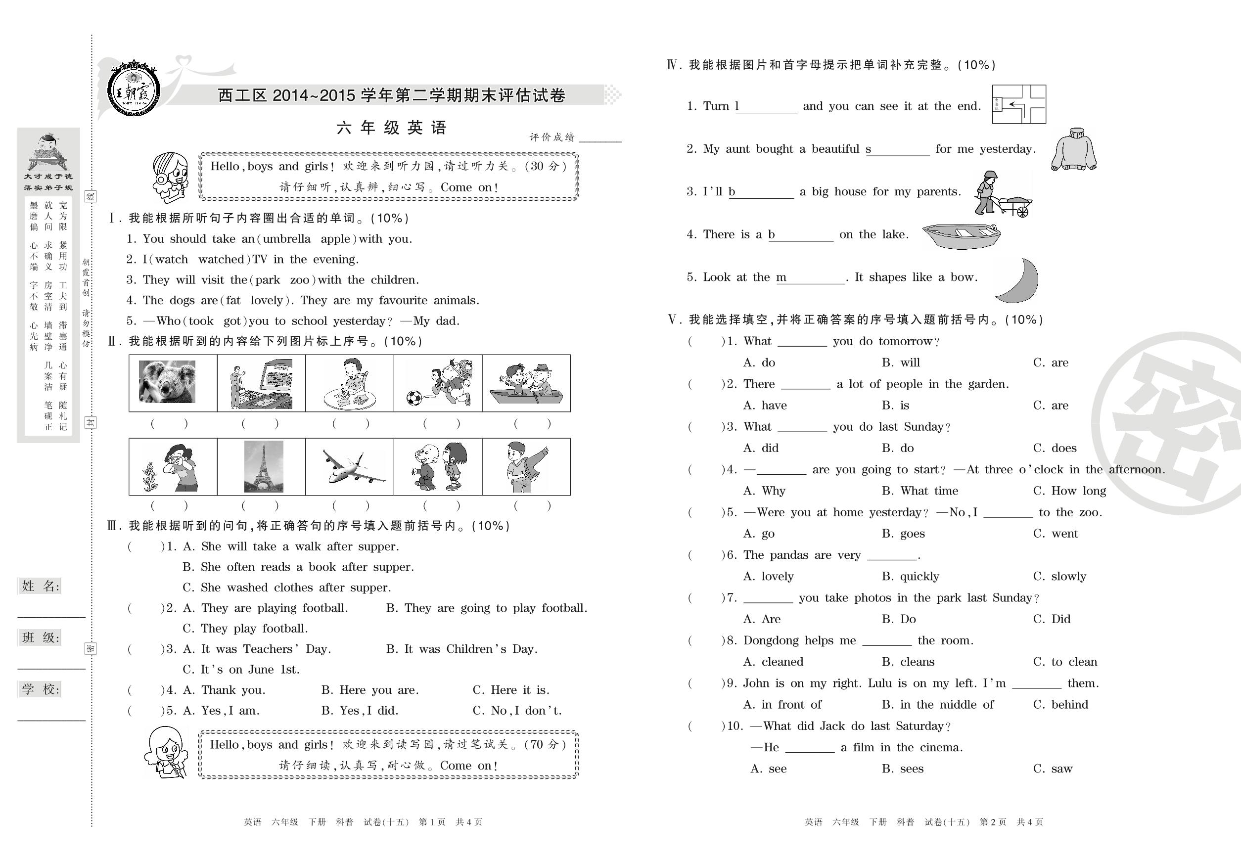 2014-2015学年第二学期洛阳市西工区六年级英语试卷(科普版)【15】
