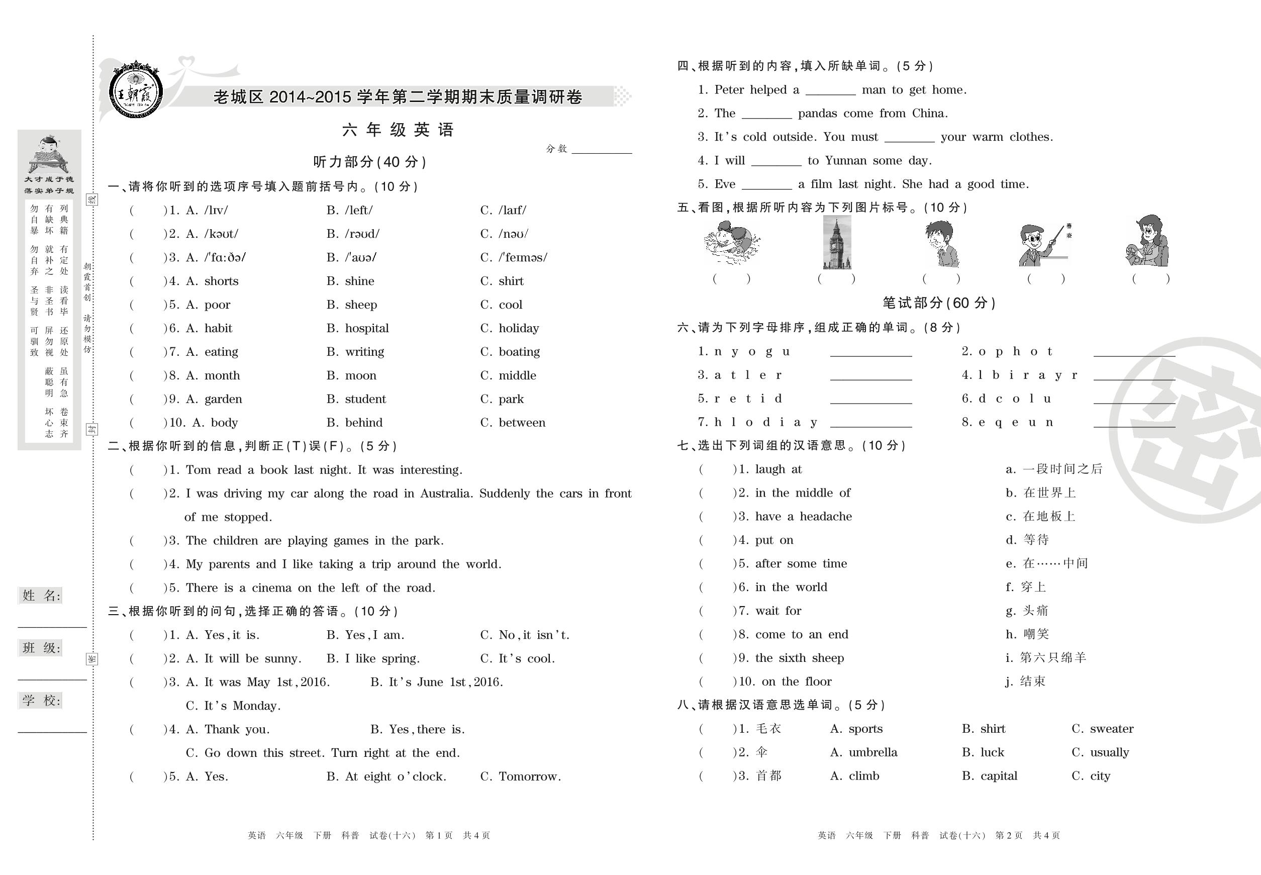 2015-2016学年第二学期洛阳市老城区六年级英语试卷(科普版)【16】
