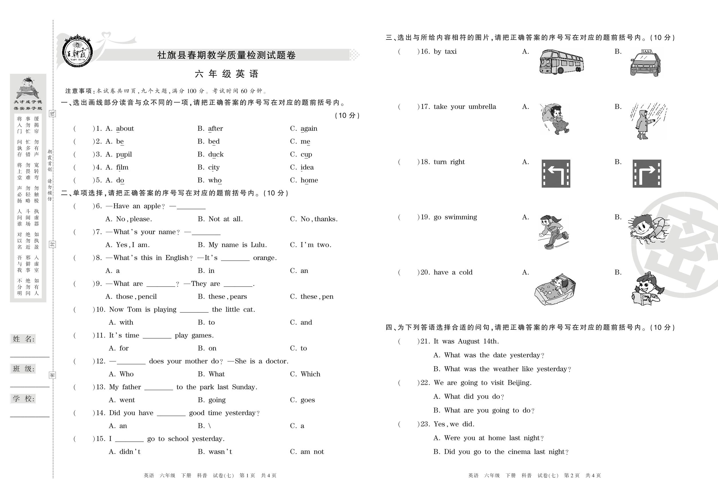 2015-2016学年第二学期南阳市社旗县六年级英语试卷(科普版)【7】