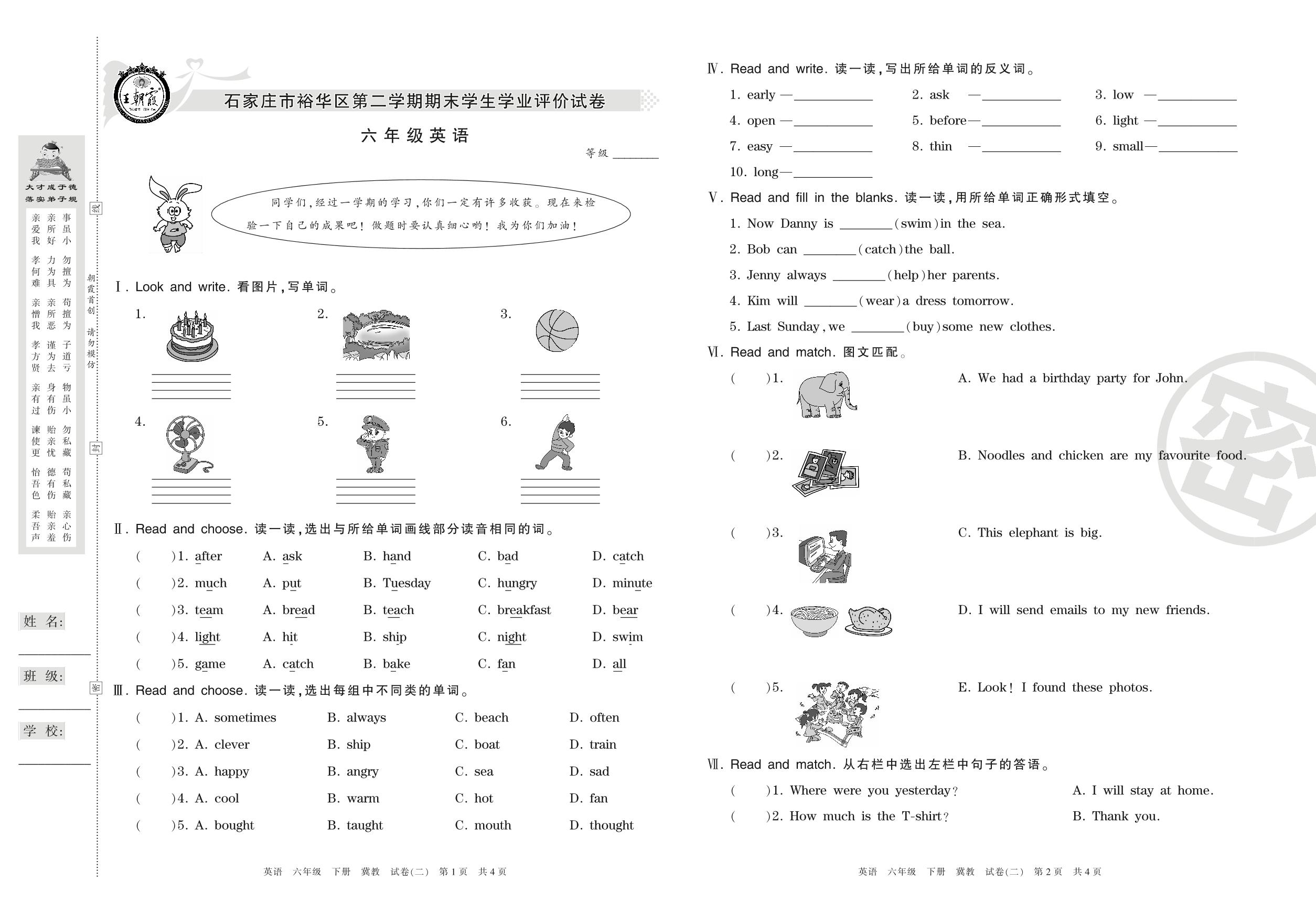 六年级英语冀教版下册期末卷