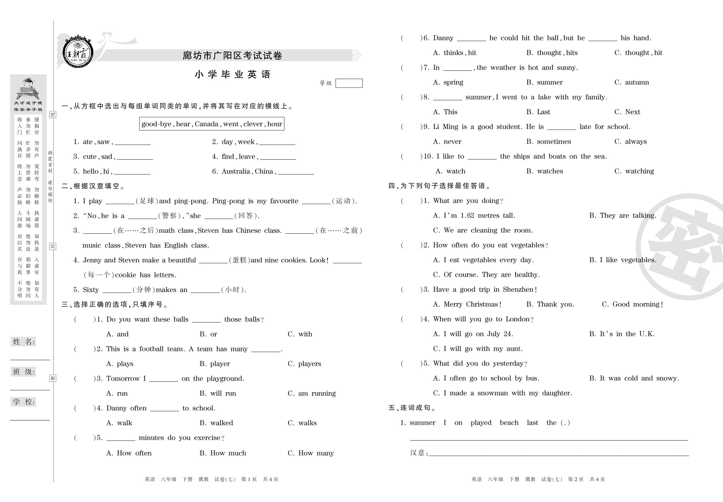 2015-2016学年第二学期廊坊市广阳区六年级英语试卷(冀教版)【7】