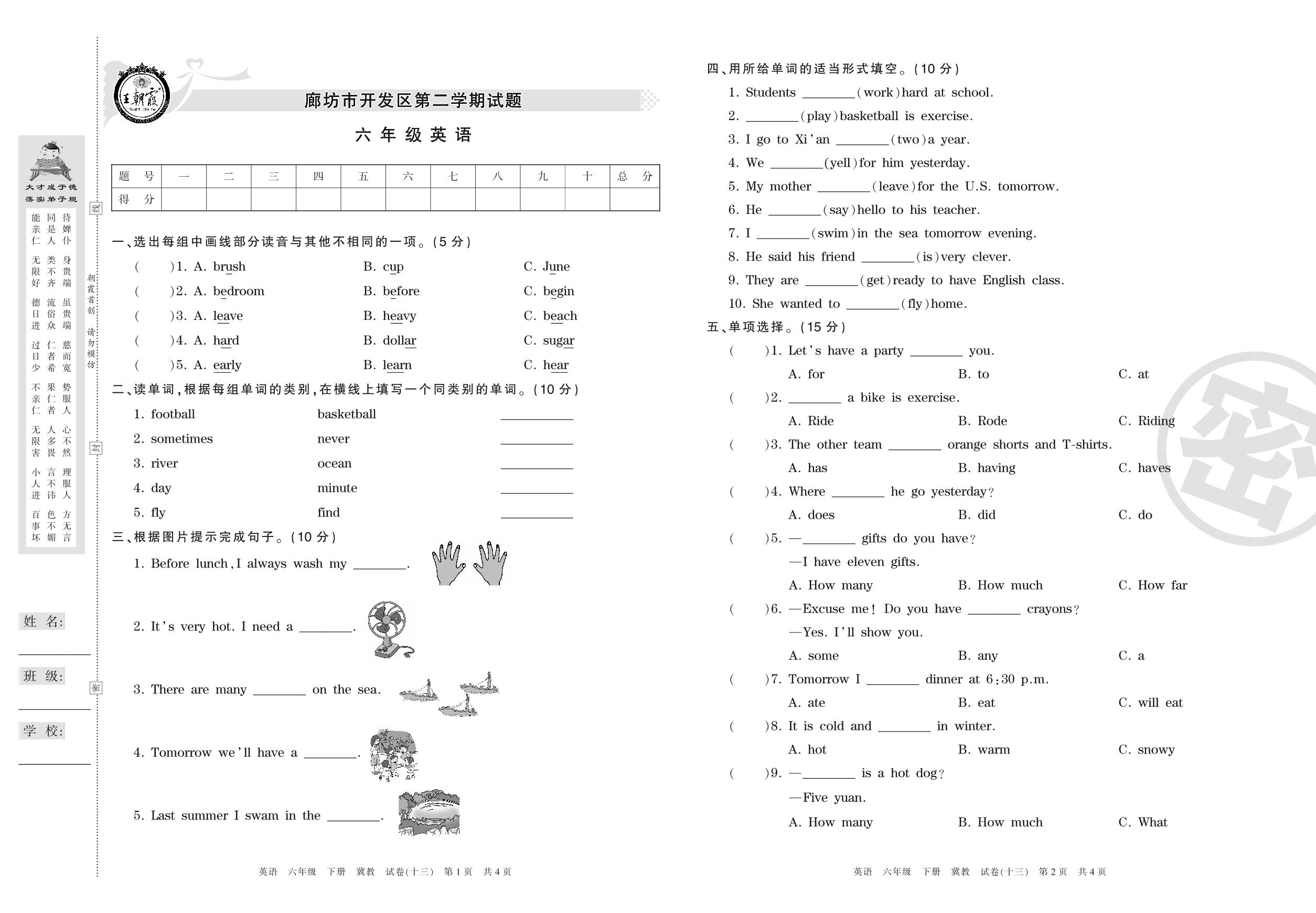 六年级英语冀教版下册期末卷