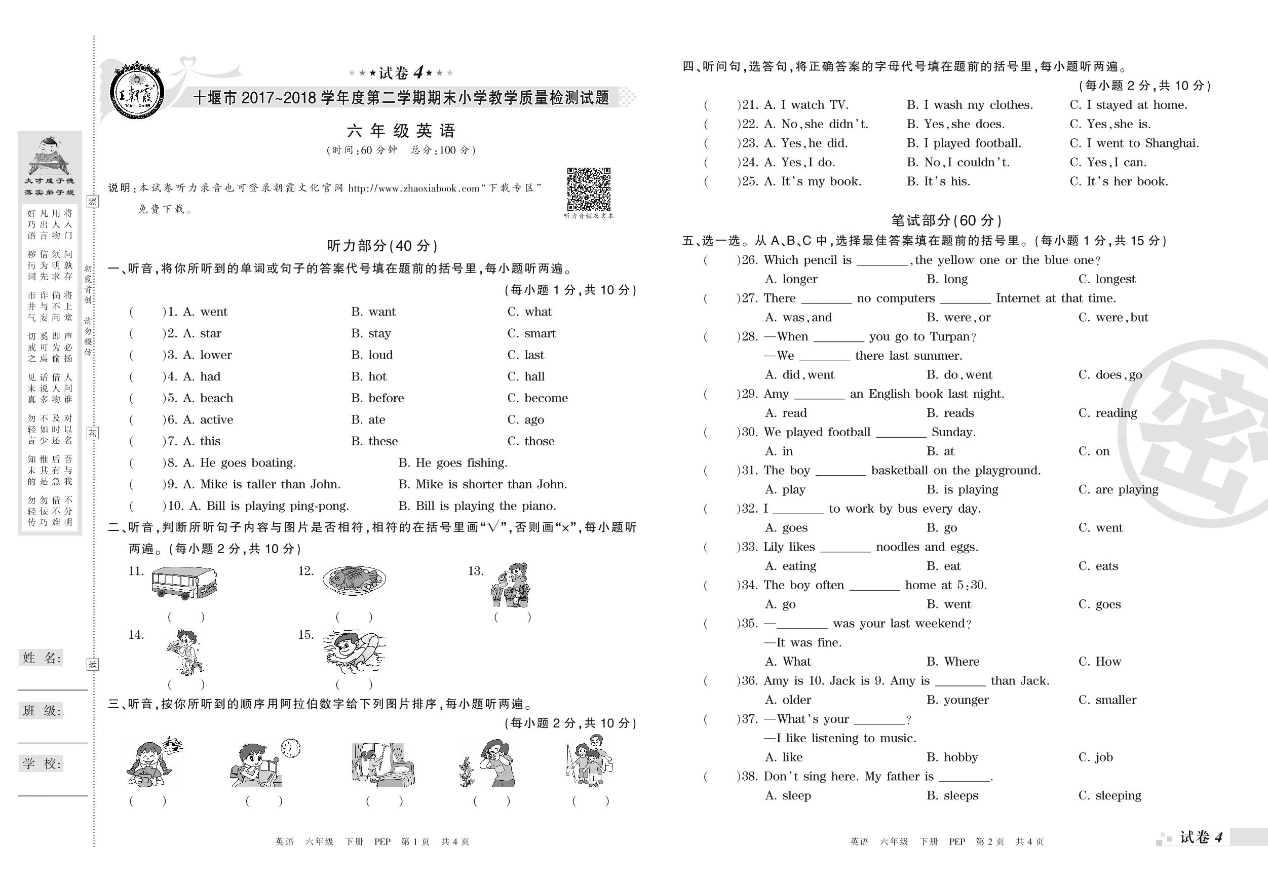 2017-2018学年第二学期十堰市六年级英语试卷(PEP版)【4】