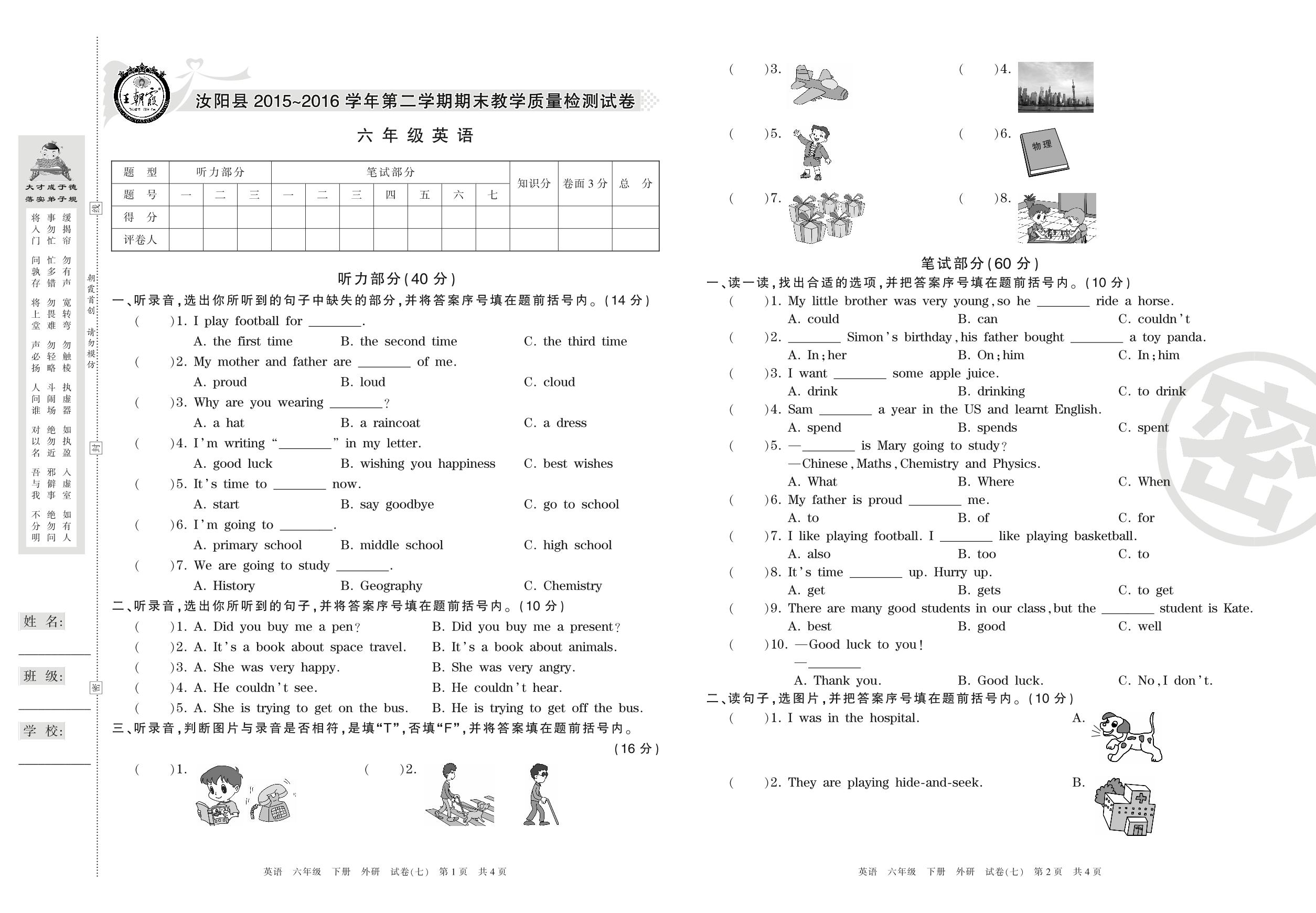 2015-2016学年第二学期洛阳市汝阳县六年级英语试卷(外研版)【7】