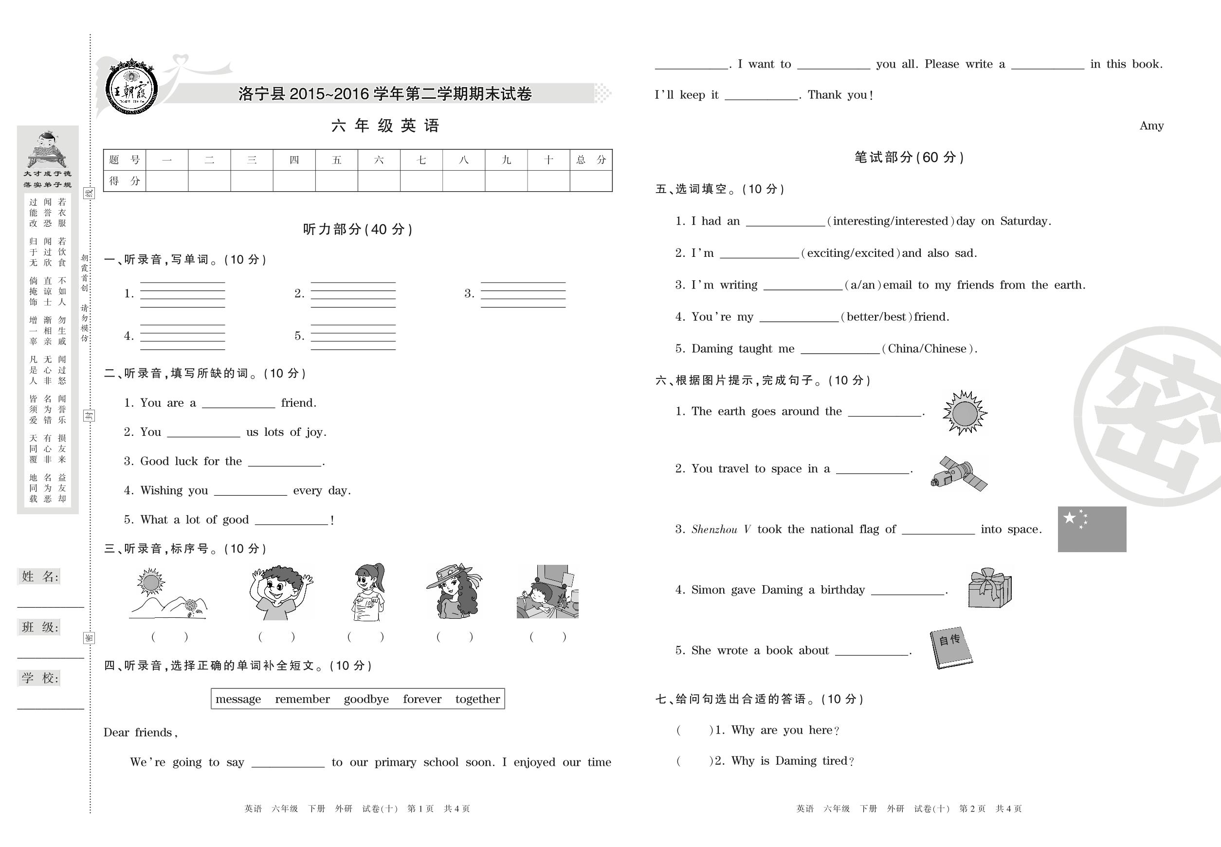 2015-2016学年第二学期洛阳市洛宁县六年级英语试卷(外研版)【10】
