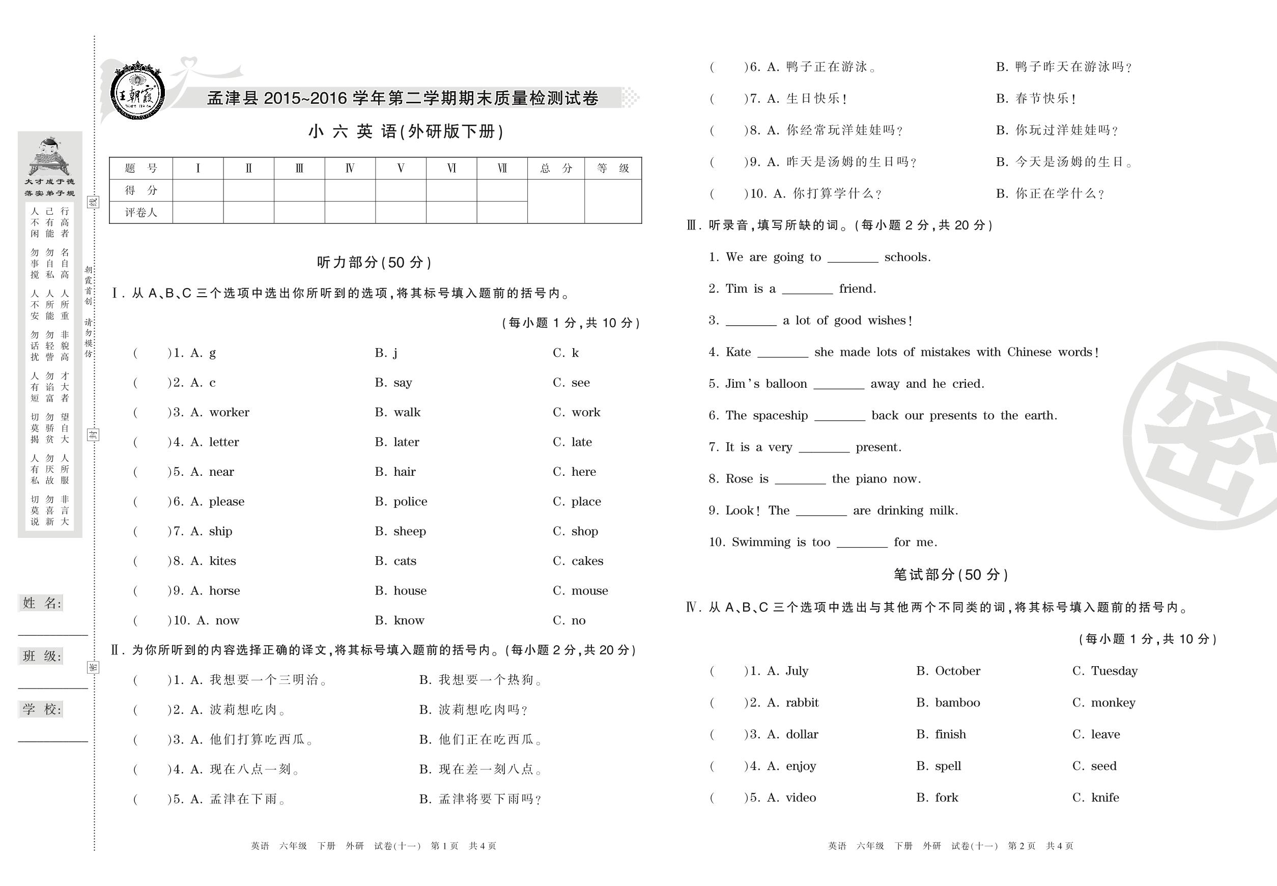 2015-2016学年第二学期洛阳市孟津县六年级英语试卷(外研版)【11】