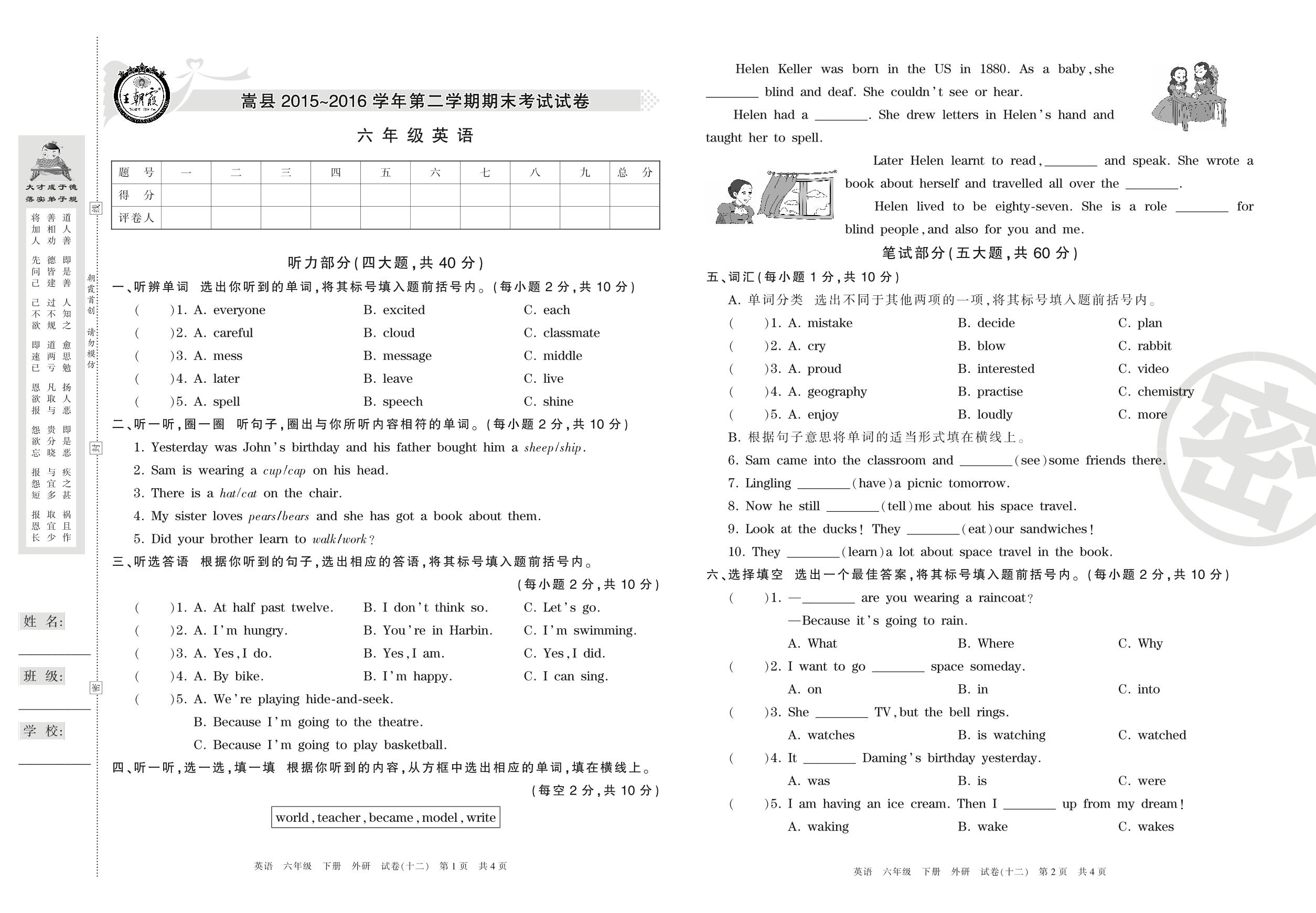 2015-2016学年第二学期洛阳市嵩县六年级英语试卷(外研版)【12】