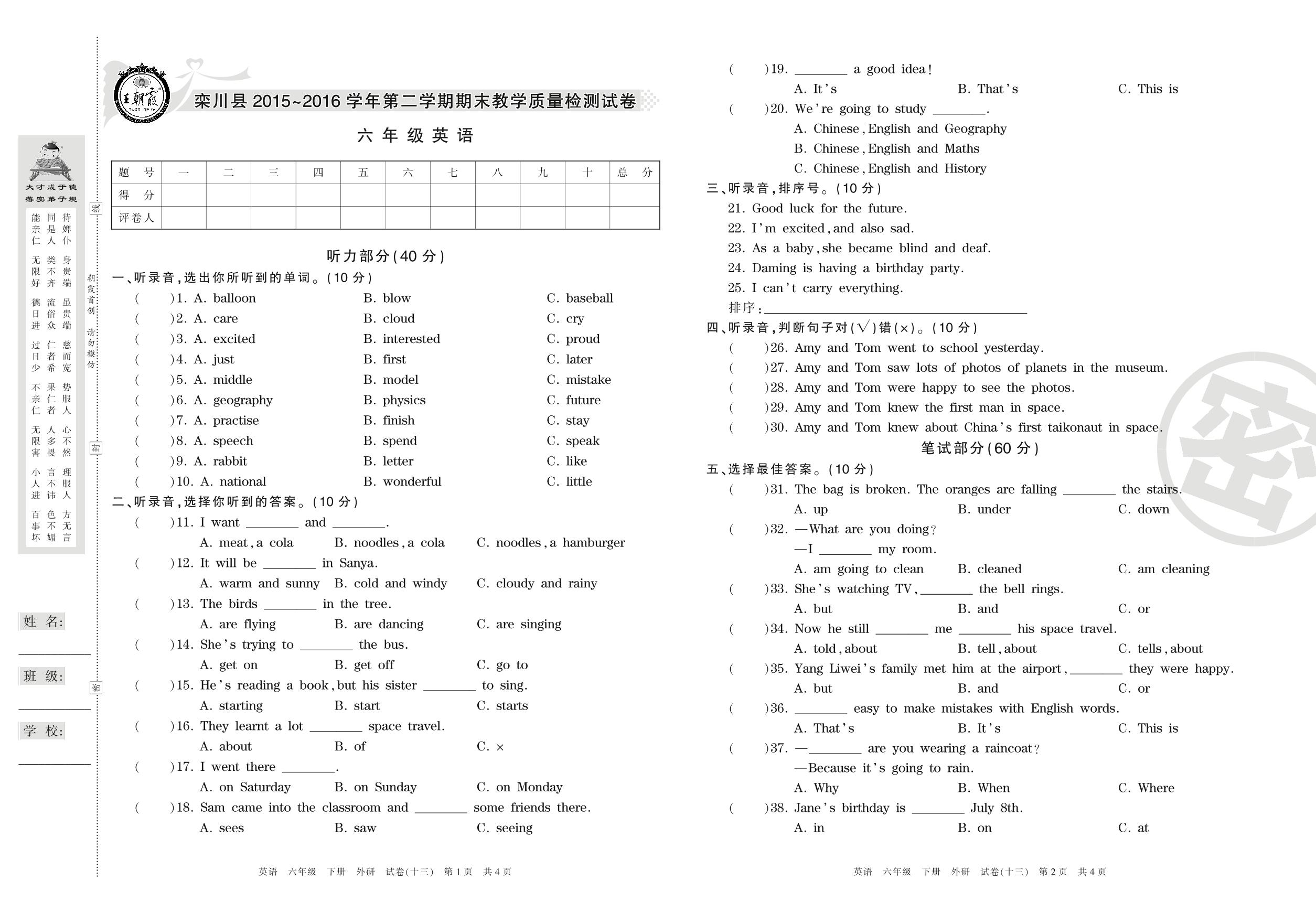 2015-2016学年第二学期洛阳市栾川县六年级英语试卷(外研版)【13】