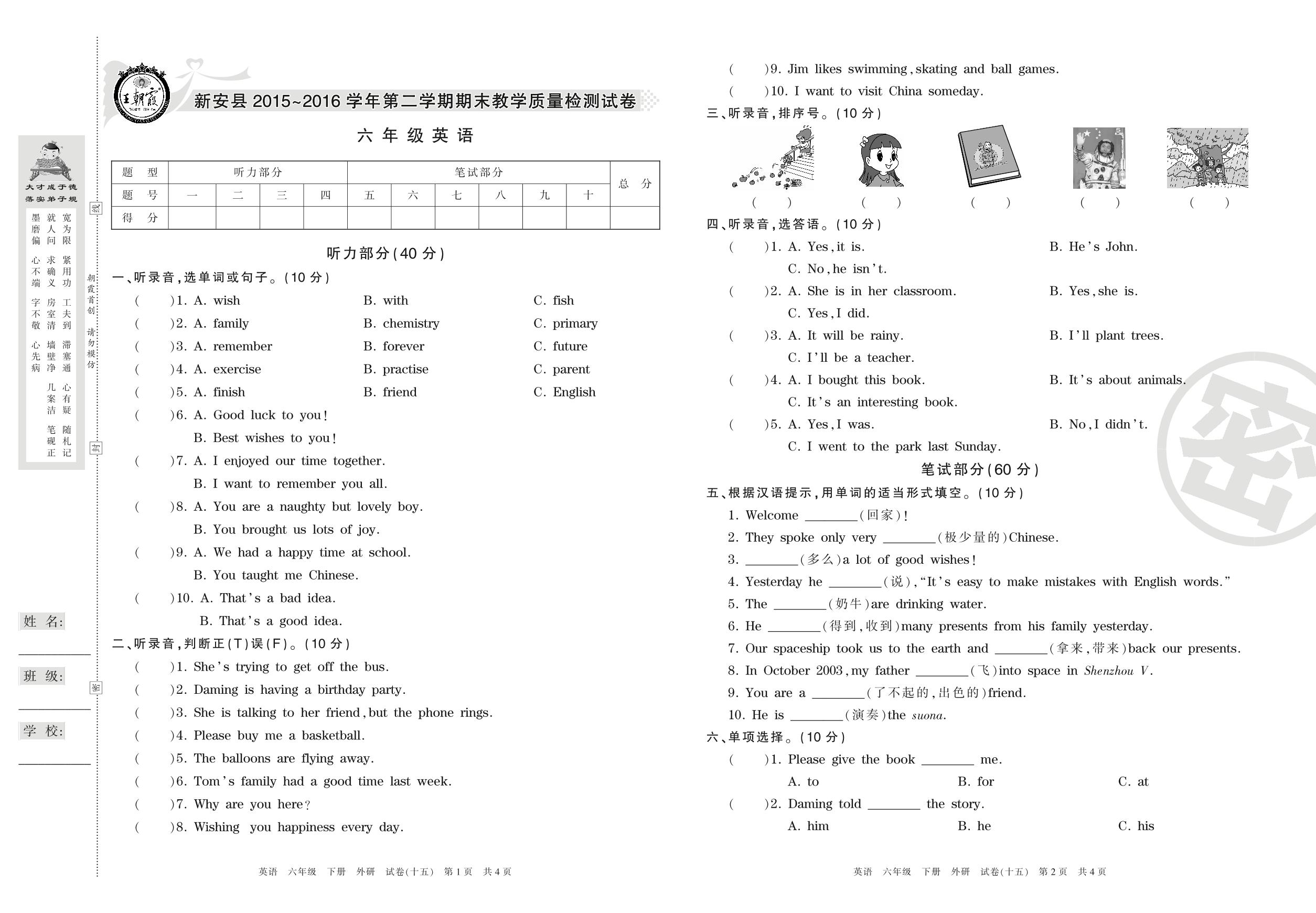 2015-2016学年第二学期洛阳市新安县六年级英语试卷(外研版)【15】