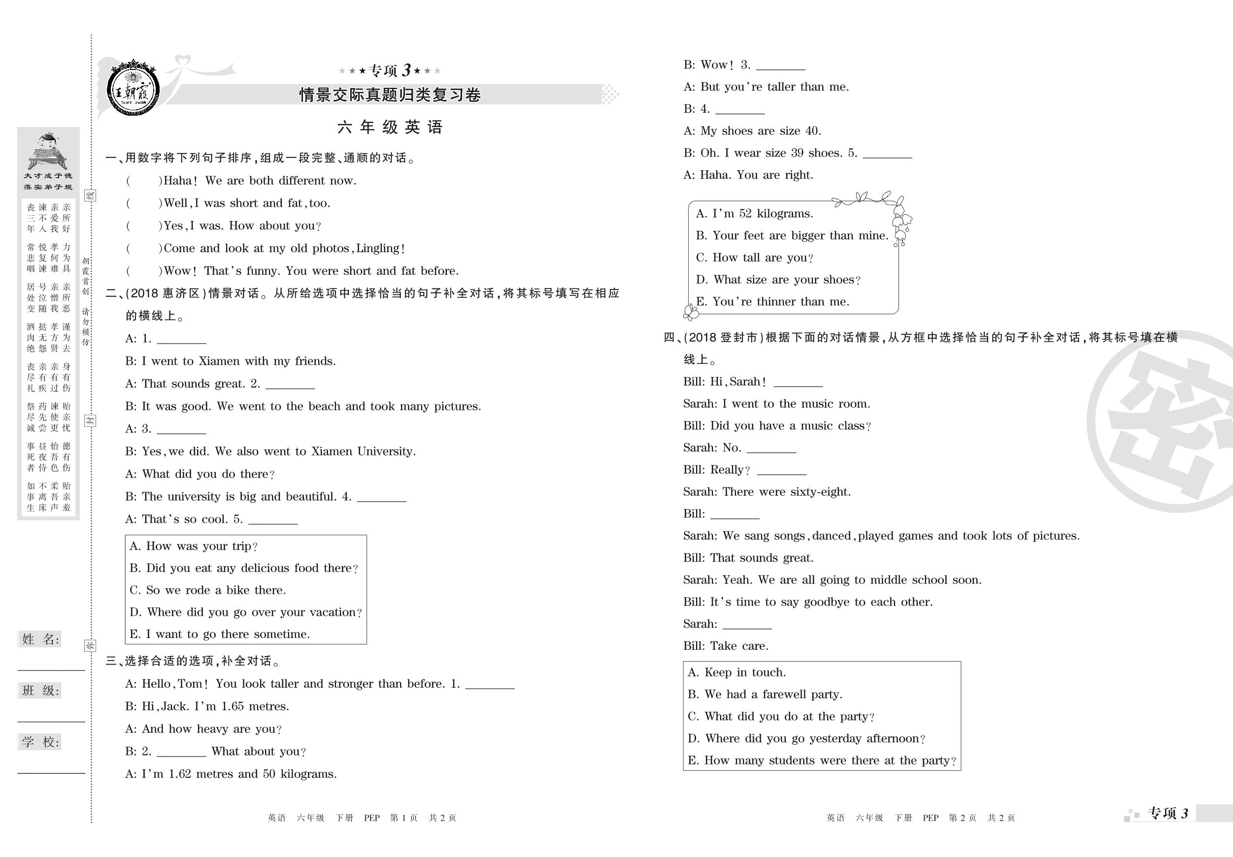 王朝霞期末专项卷——情景交际、阅读理解与写作真题归类复习卷六年级下册英语(PEP版)_R210807170337【0】