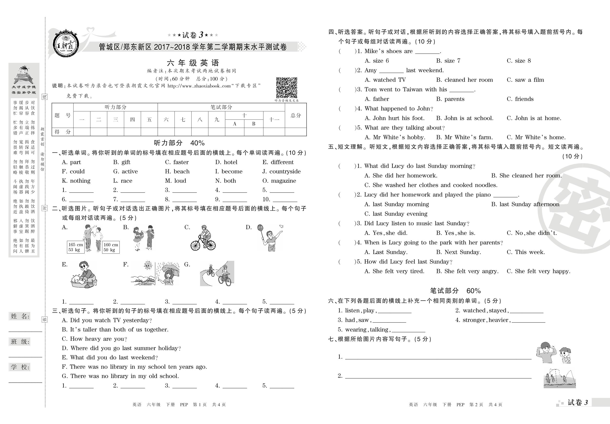 2017-2018学年第二学期郑州市管城区、郑东新区六年级英语试卷(PEP版)【3】