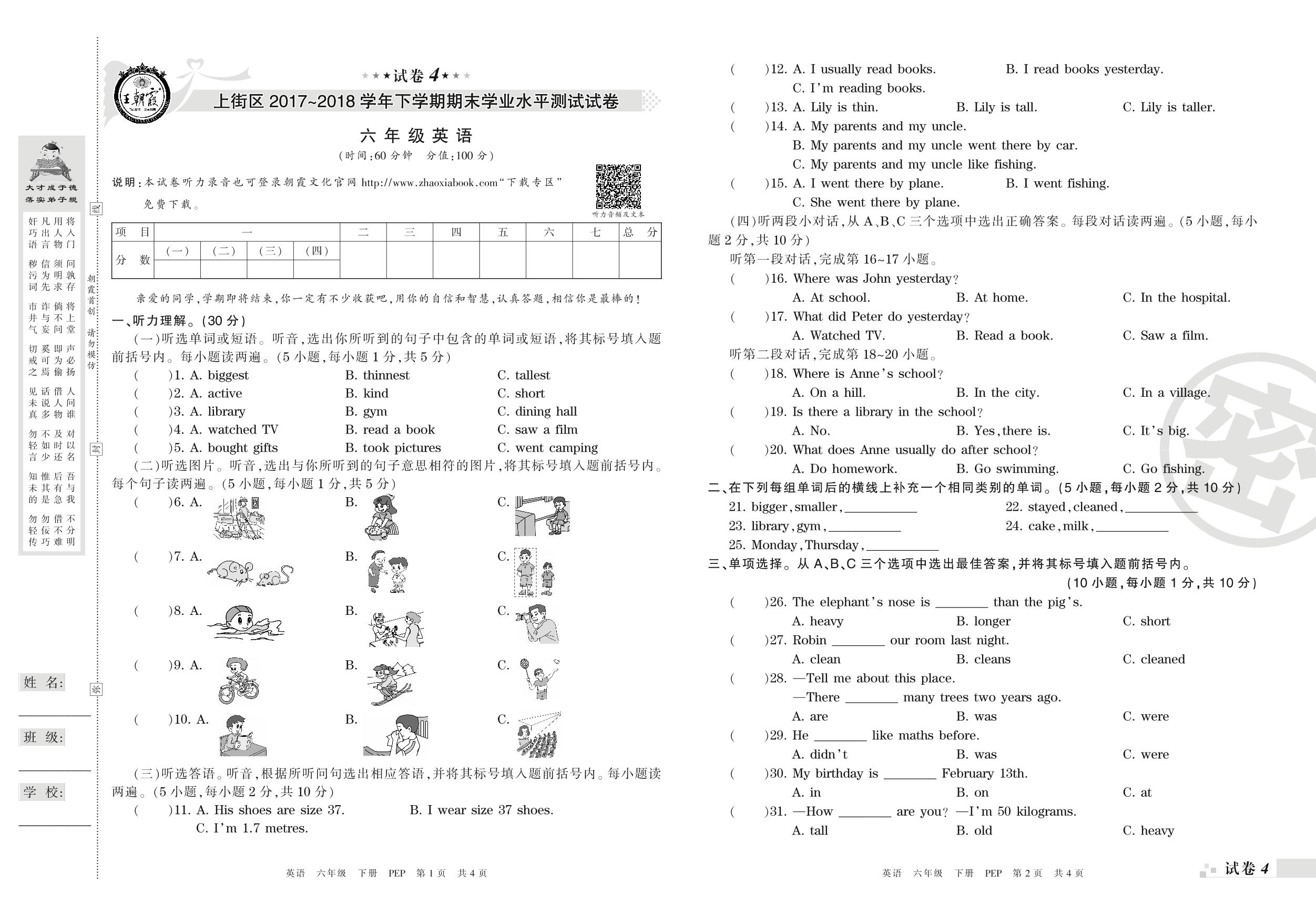 2017-2018学年第二学期郑州市上街区六年级英语试卷(PEP版)【4】