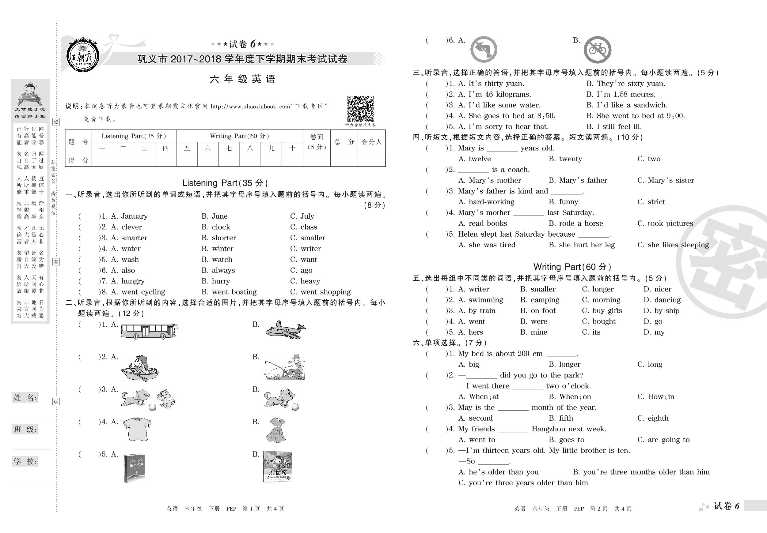 2017-2018学年第二学期巩义市六年级英语试卷(PEP版)【6】