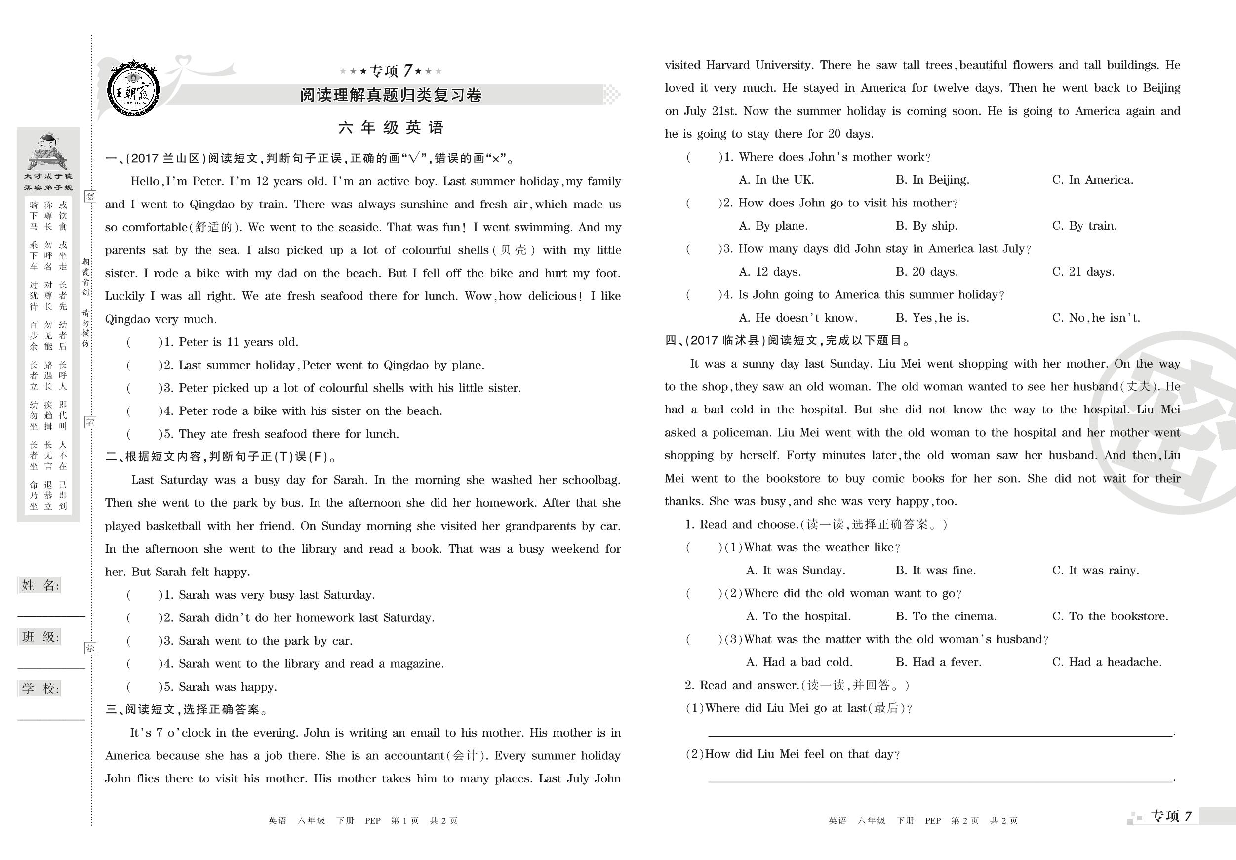 王朝霞期末专项卷——阅读理解、写作真题归类复习卷六年级下册英语(PEP版)_R210807170437【0】