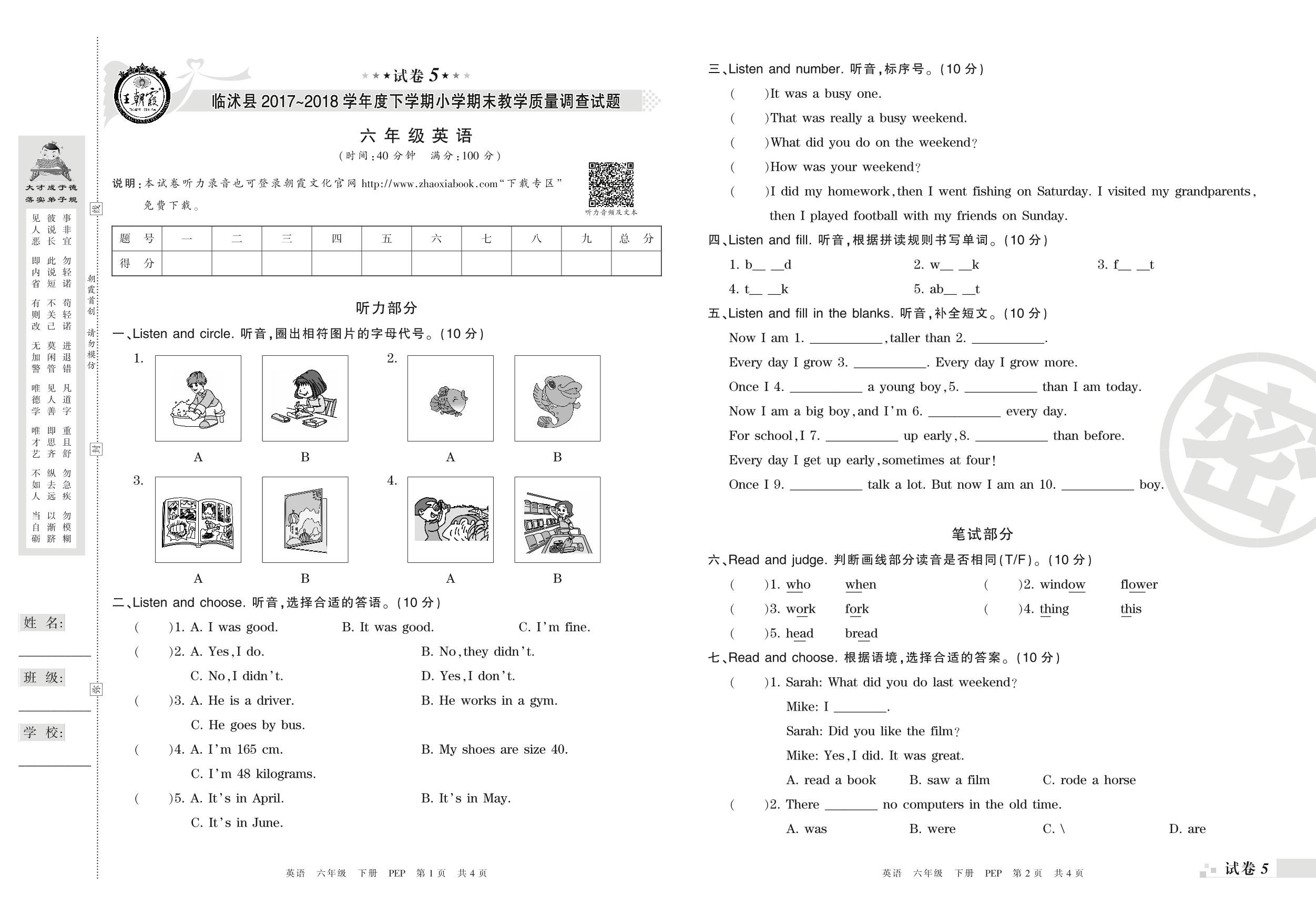 2017-2018学年第二学期临沂市临沭县六年级英语试卷(PEP版)【5】