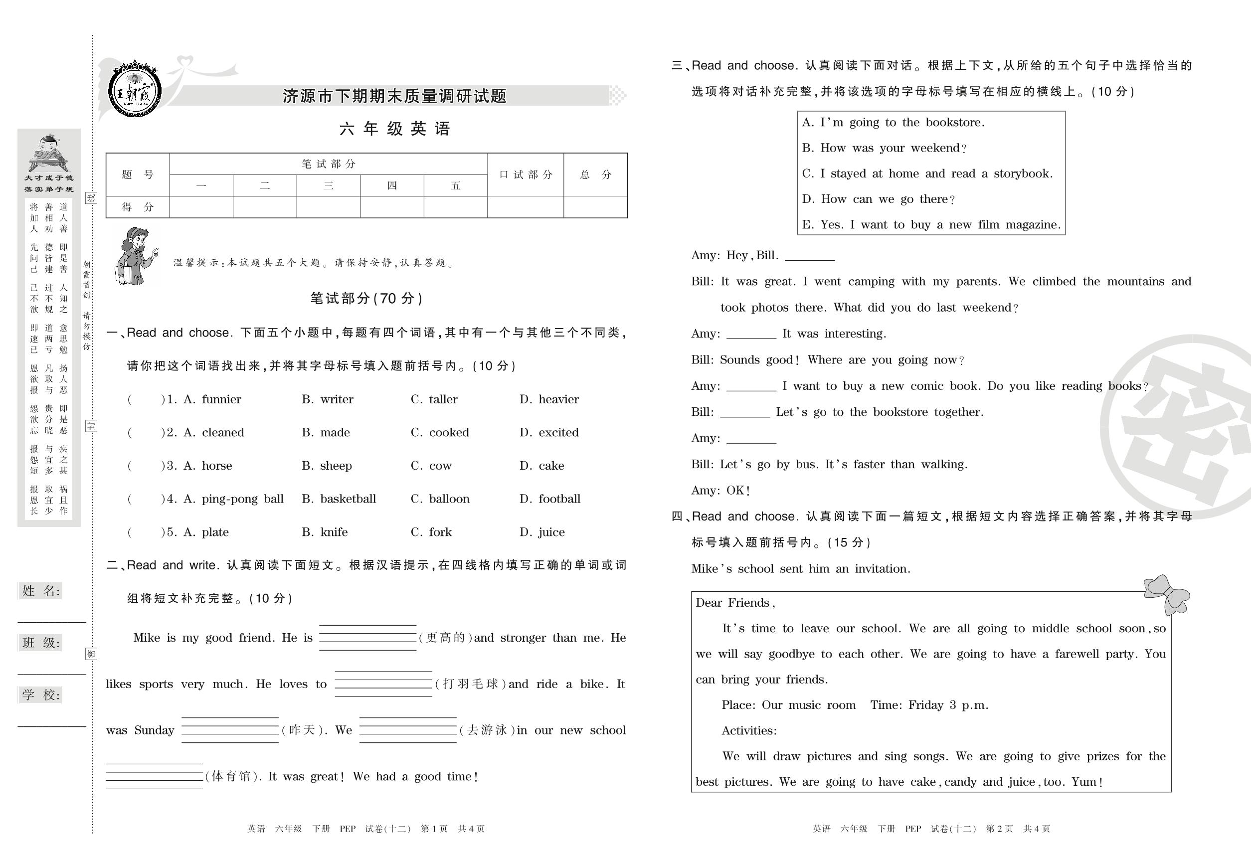 六年级英语人教PEP版(三起始)下册期末卷