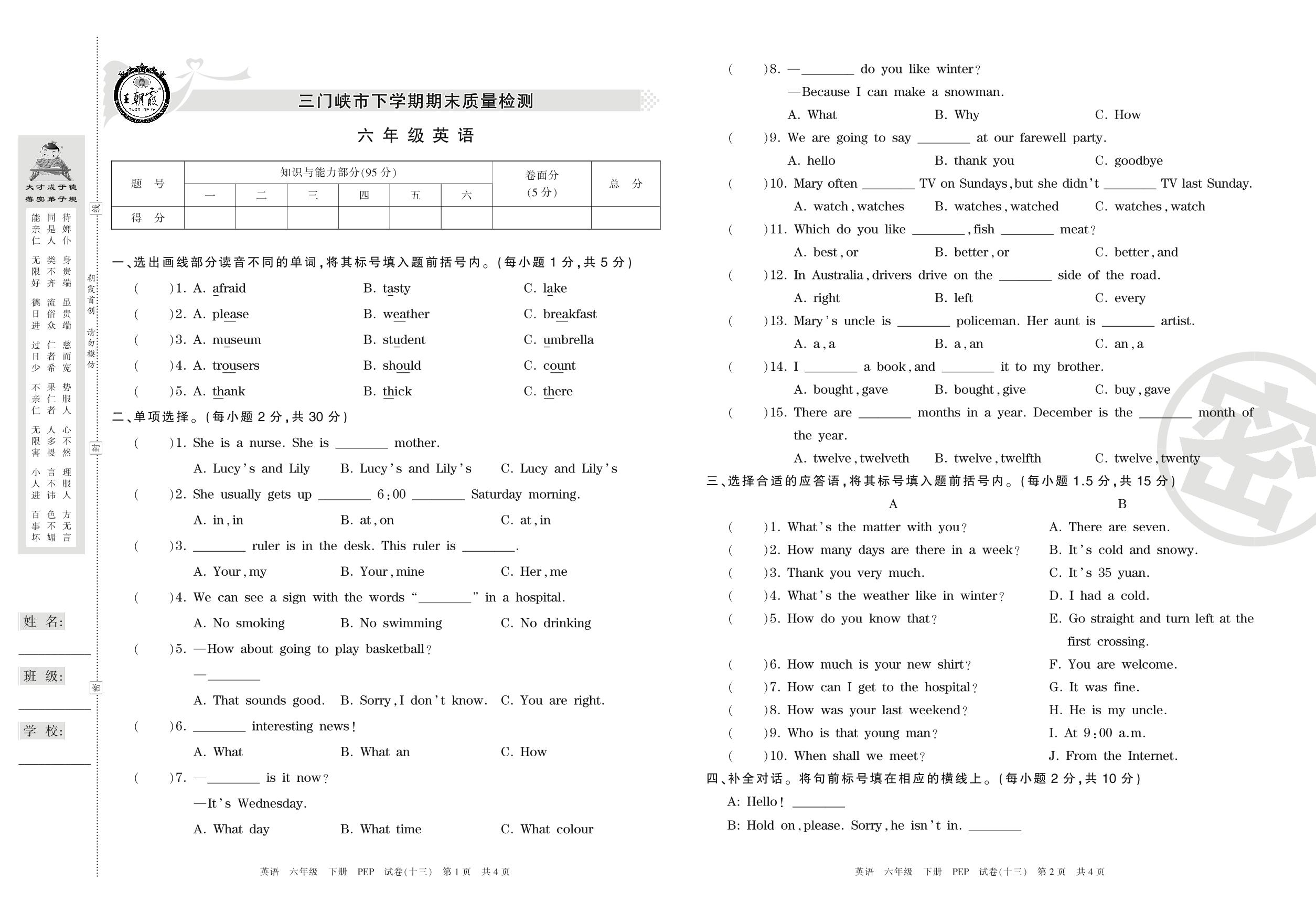 2015-2016学年第二学期三门峡市六年级英语试卷(PEP版)【13】