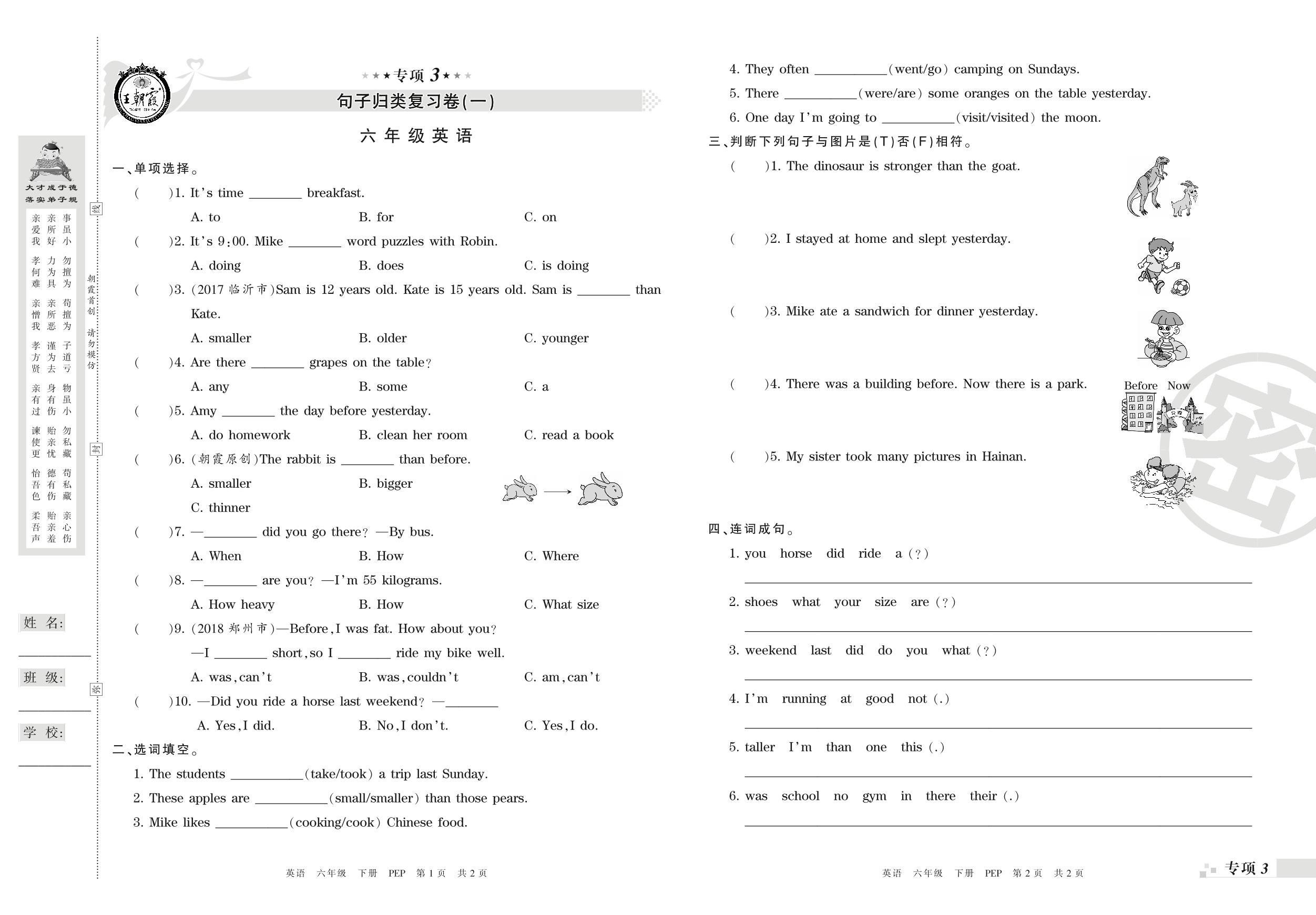 王朝霞期末专项卷——句子(一)(二)真题归类复习卷六年级下册英语(PEP版)_R210807170711【0】