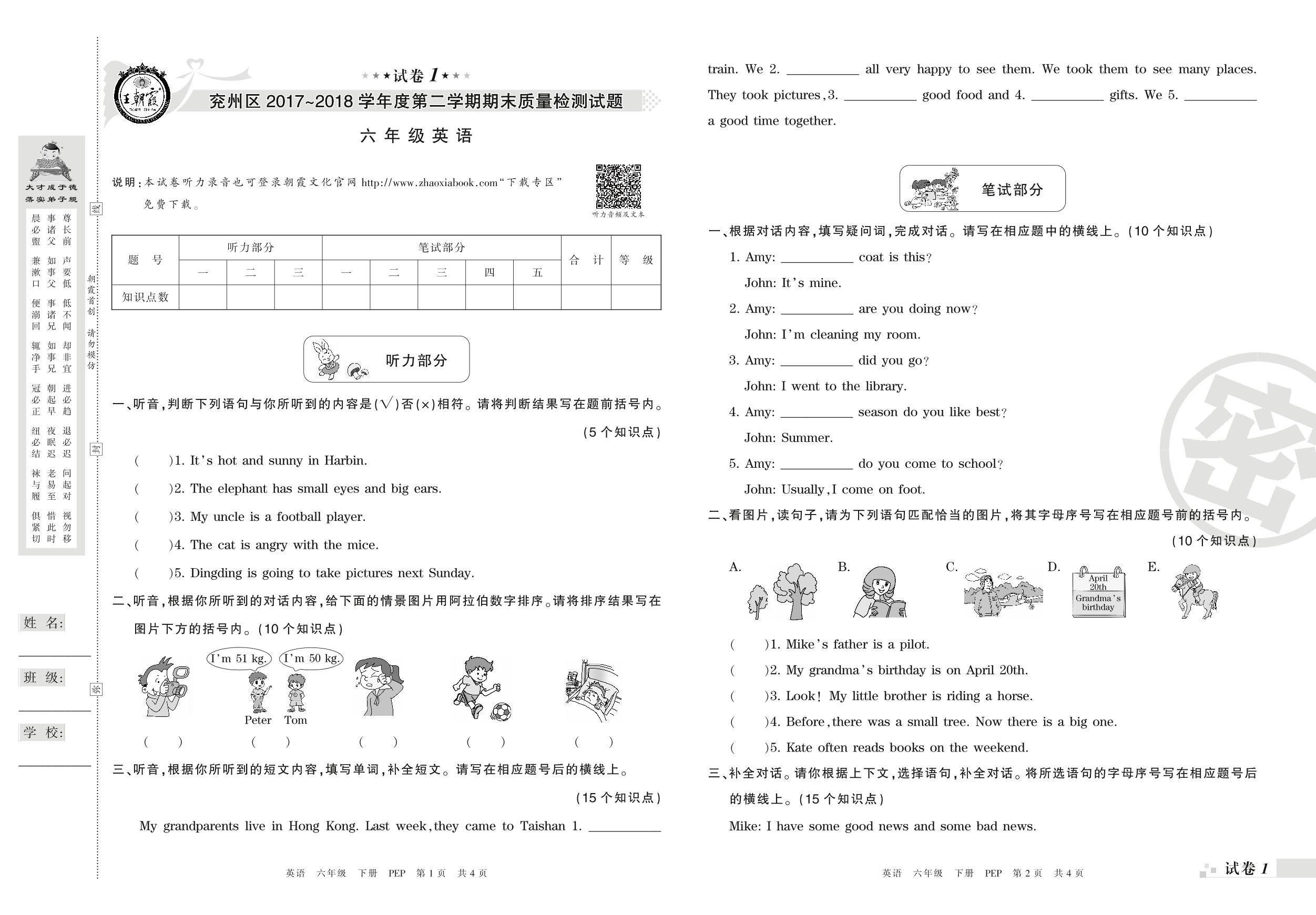 2017-2018学年第二学期济宁市兖州区六年级英语试卷(PEP版)【1】