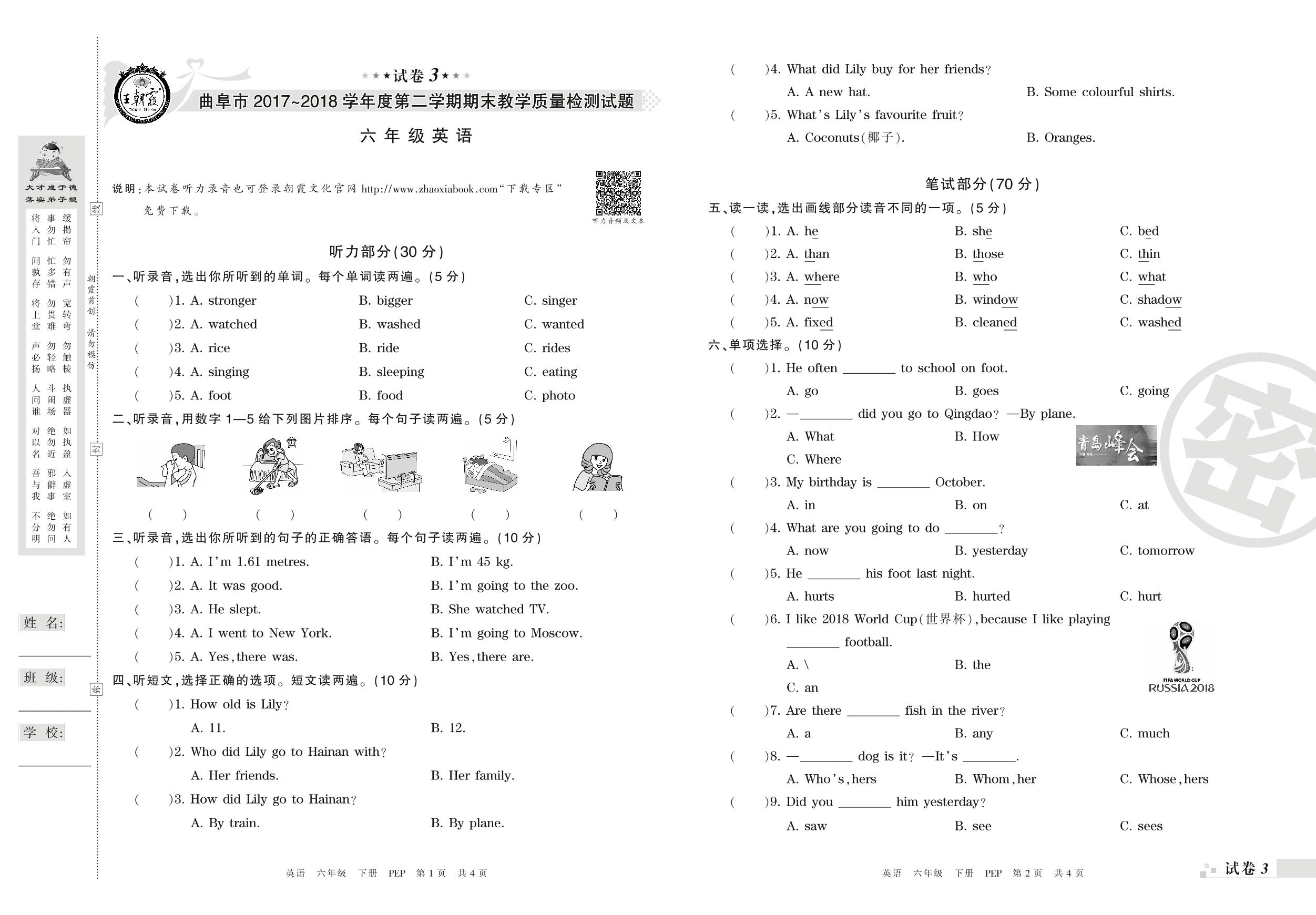 2017-2018学年第二学期曲阜市六年级英语试卷(PEP版)【3】