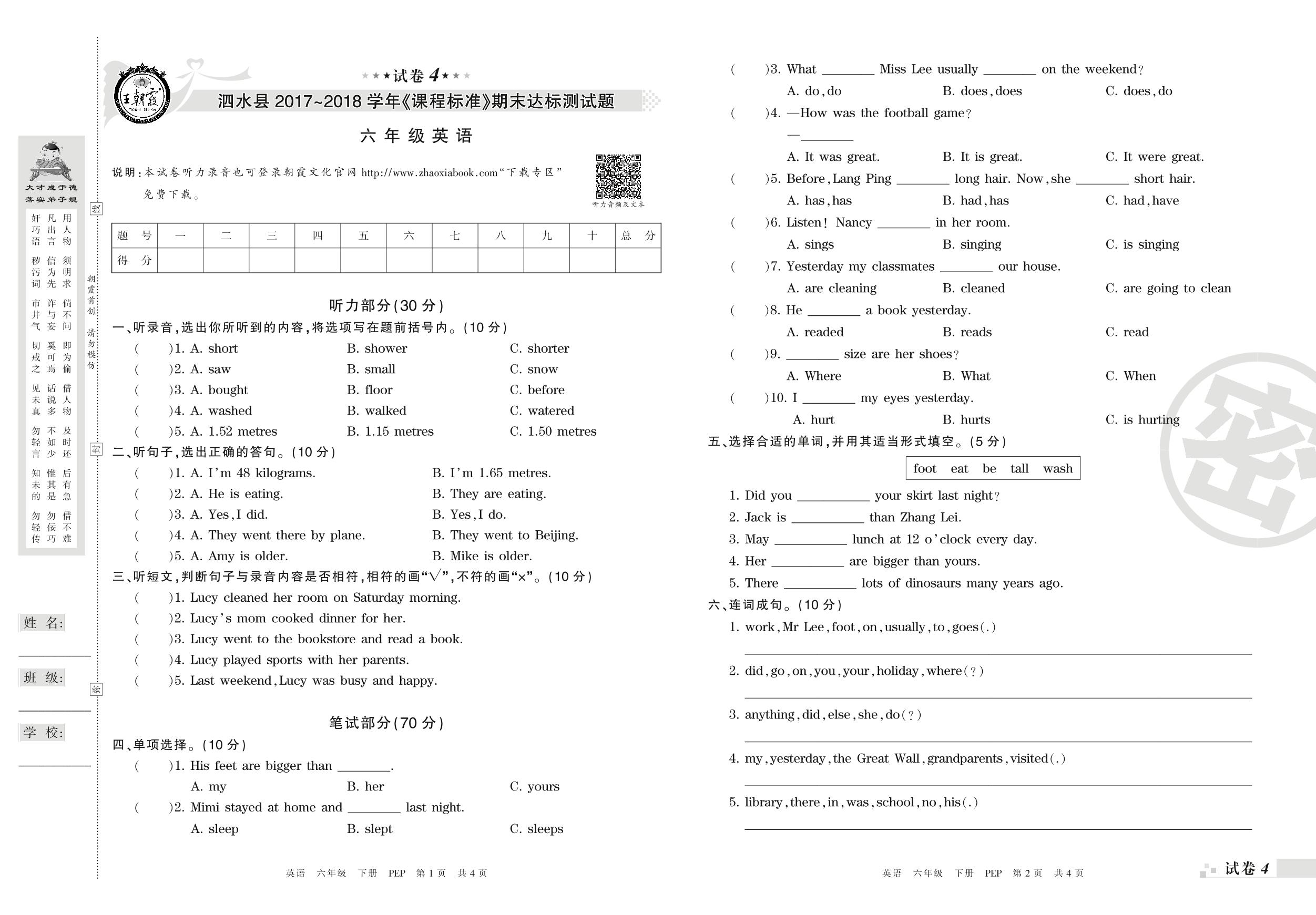 2017-2018学年第二学期济宁市泗水县六年级英语试卷(PEP版)【4】