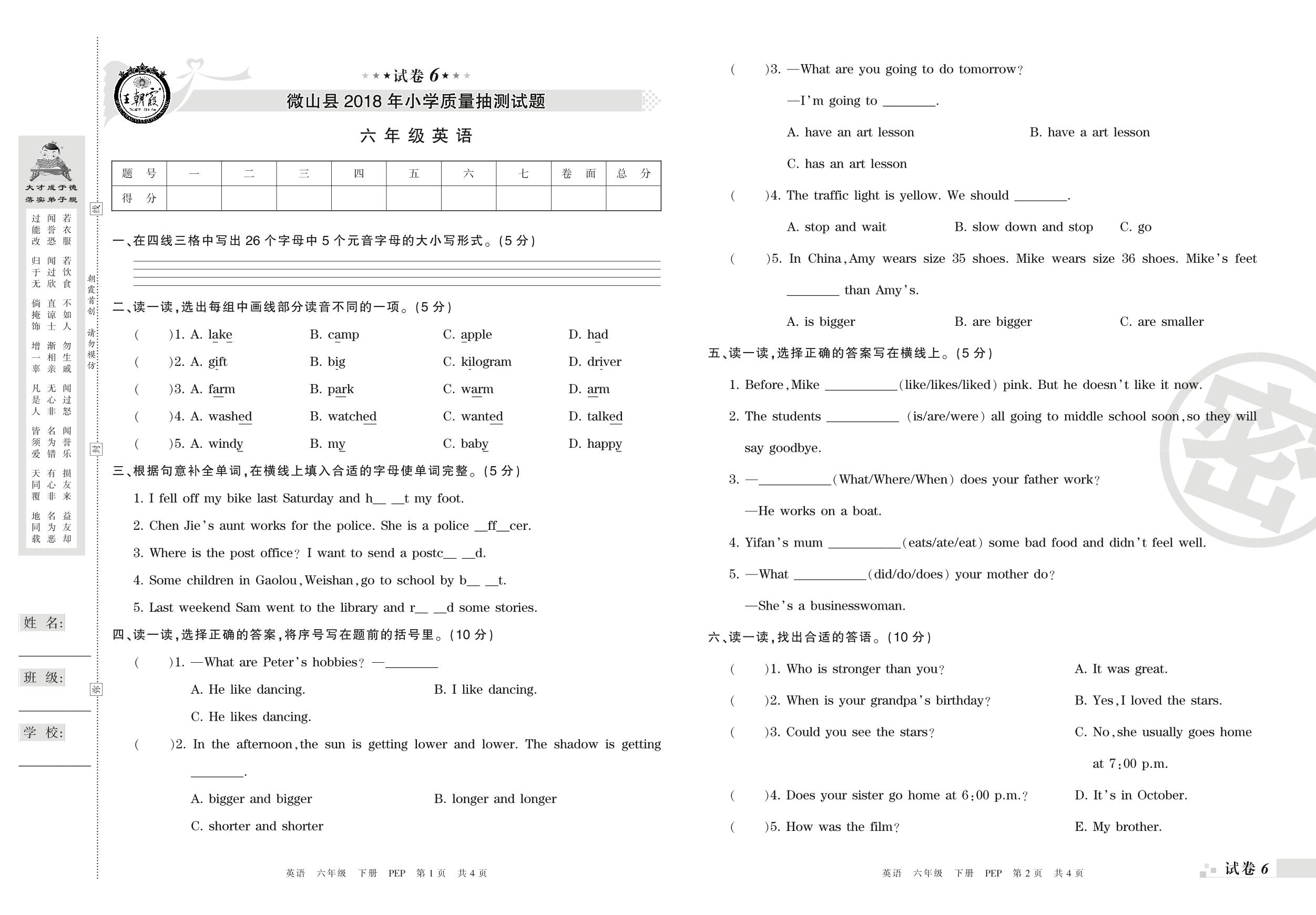 六年级英语人教PEP版(三起始)下册期末卷