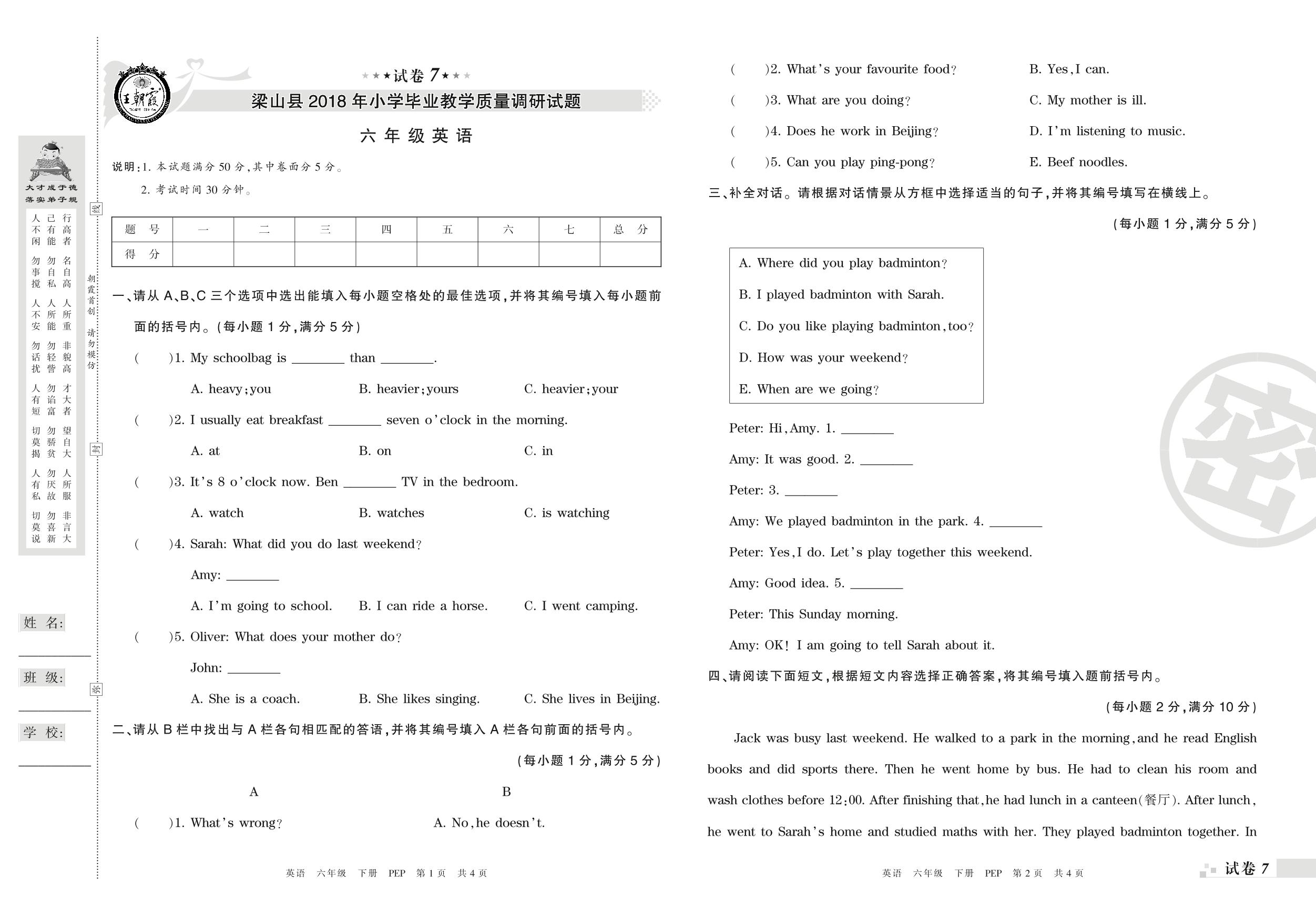 2017-2018学年第二学期济宁市梁山县六年级英语试卷(PEP版)【7】
