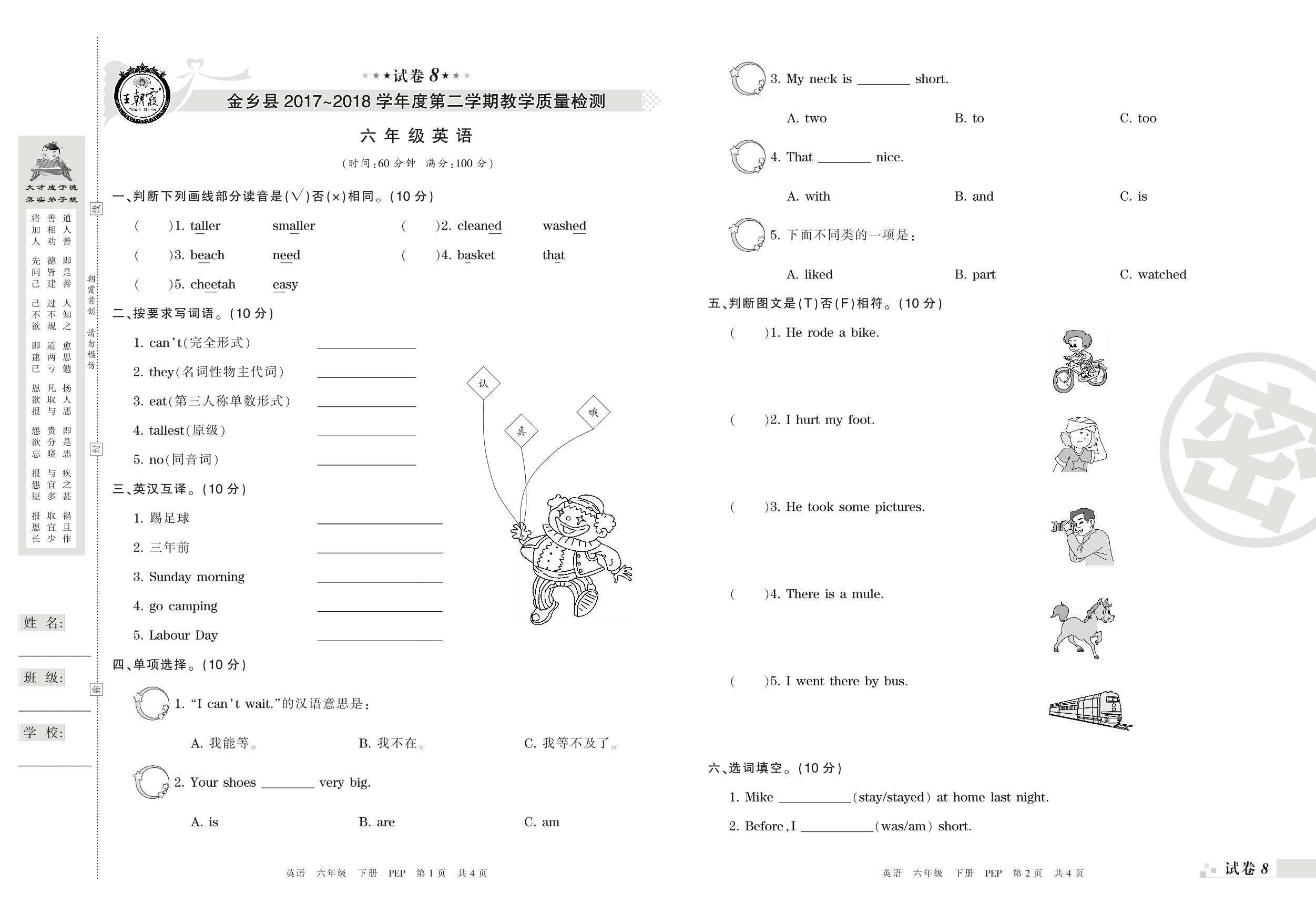 2017-2018学年第二学期济宁市金乡县六年级英语试卷(PEP版)【8】