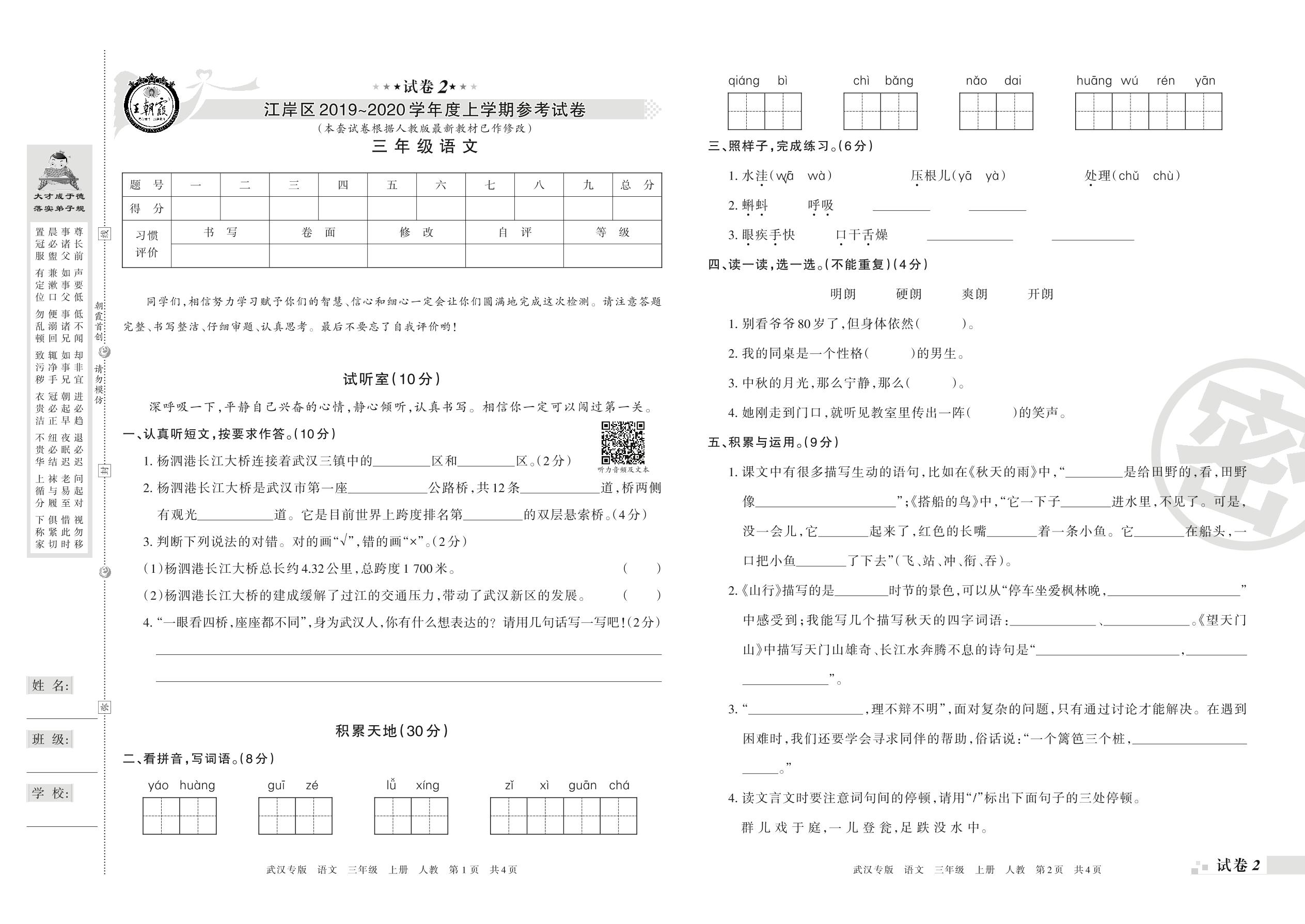 2019-2020学年第一学期武汉市江岸区三年级语文试卷(人教版)【2】