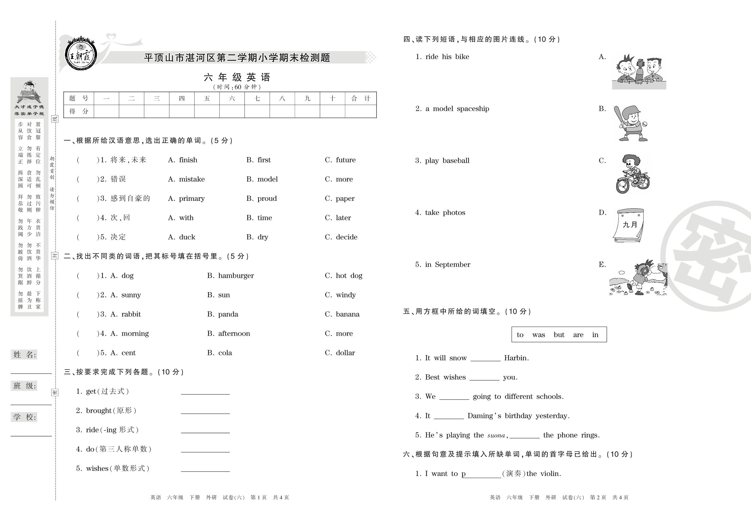 2015-2016学年第二学期平顶山市湛河区六年级英语试卷(外研版)【6】