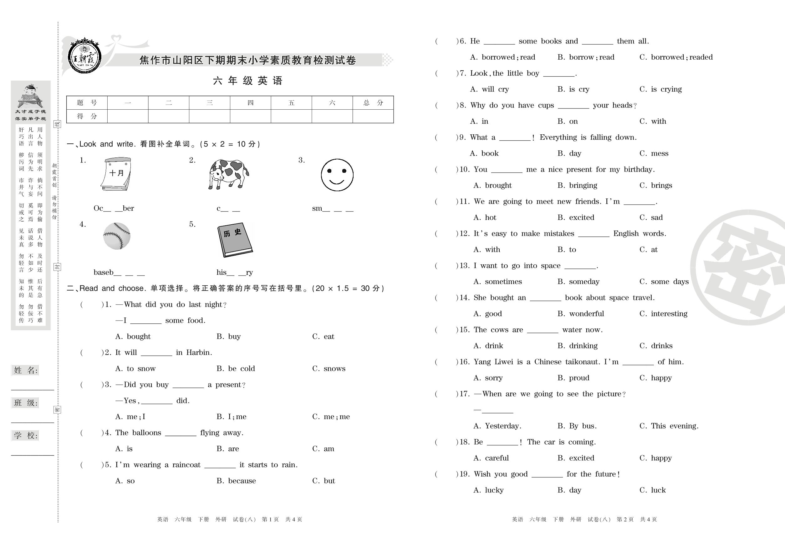 2015-2016学年第二学期焦作市山阳区六年级英语试卷(外研版)【8】