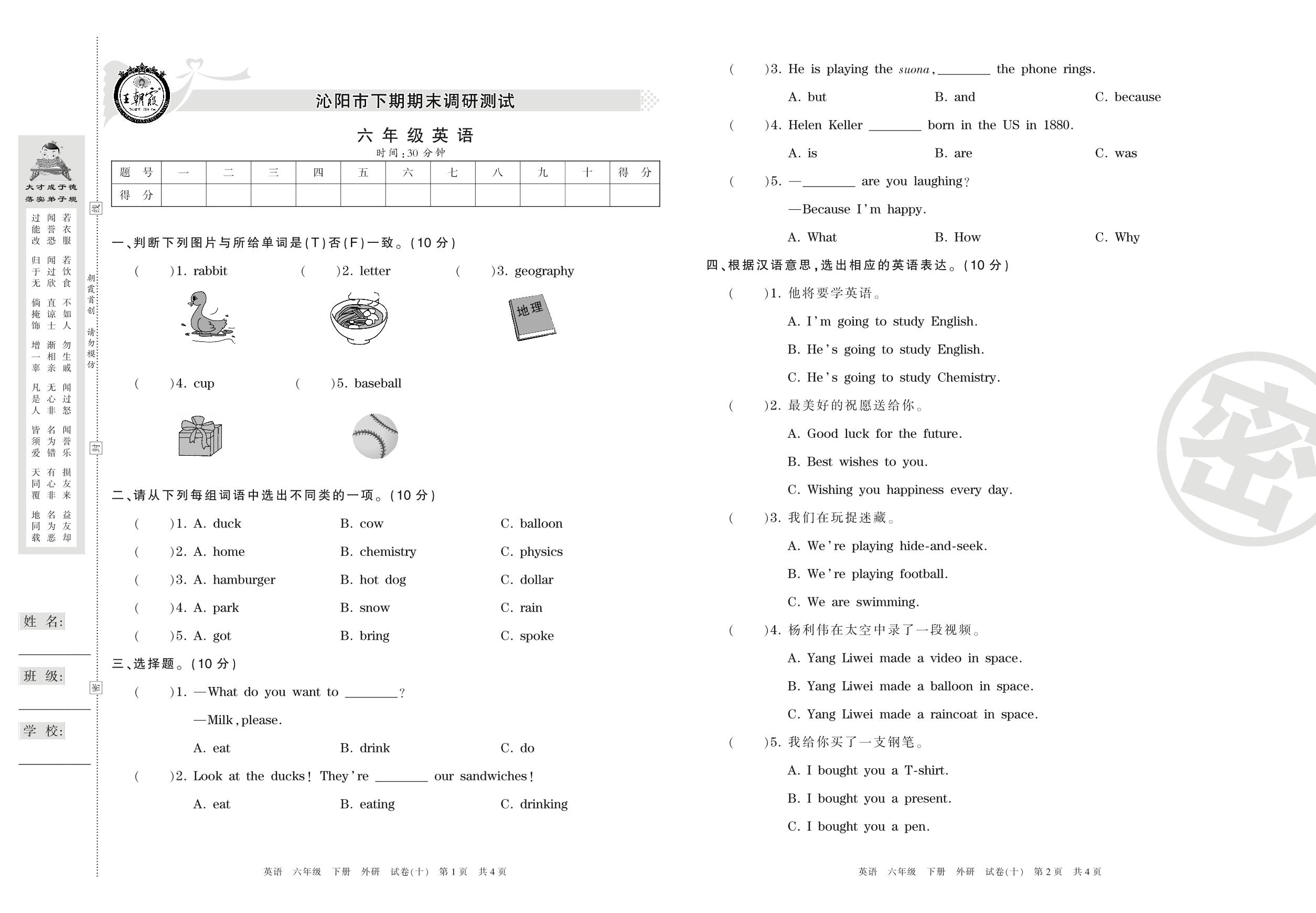 六年级英语外研版(三起始)下册期末卷