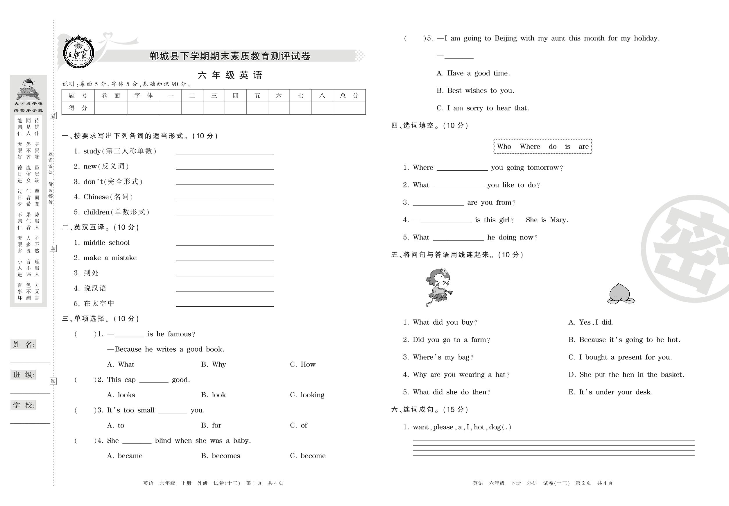 2015-2016学年第二学期周口市郸城县六年级英语试卷(外研版)【13】