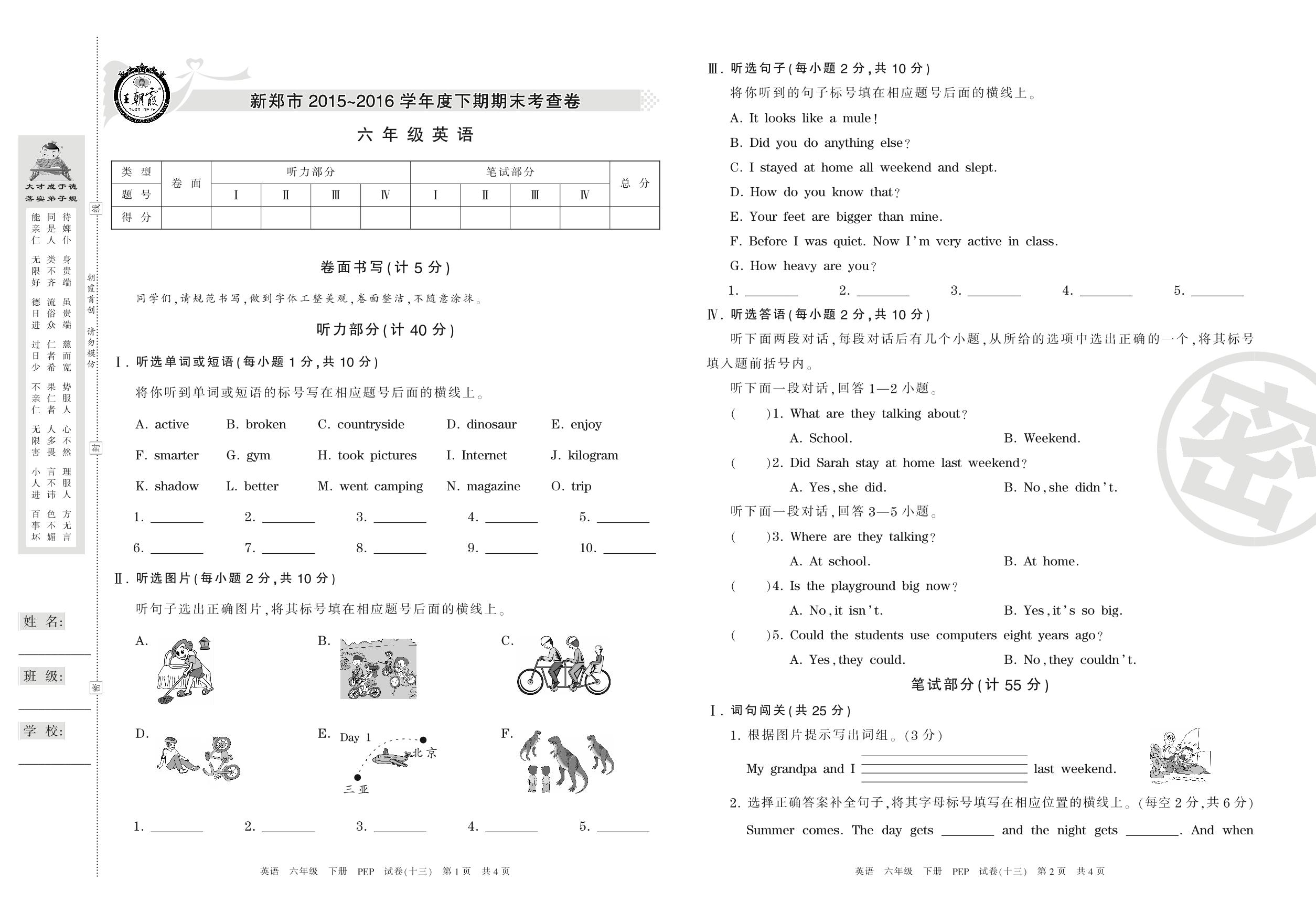 2015-2016学年第二学期新郑市六年级英语试卷(PEP版)【13】