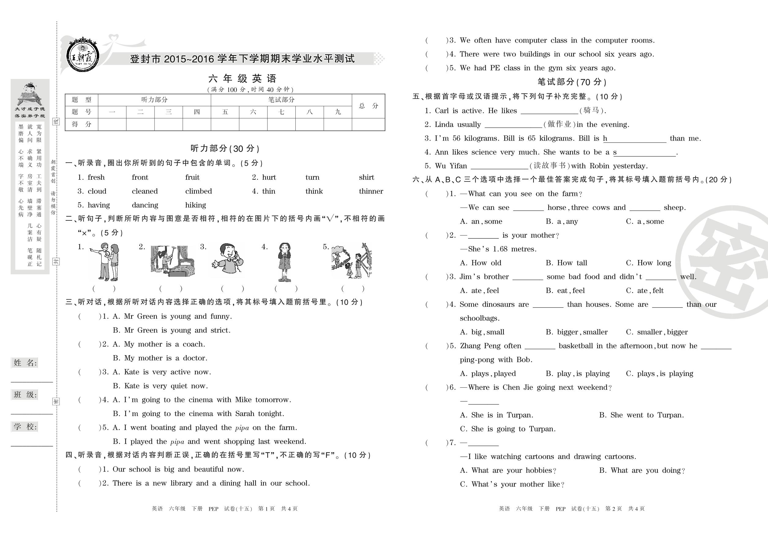2015-2016学年第二学期登封市六年级英语试卷(PEP版)【15】