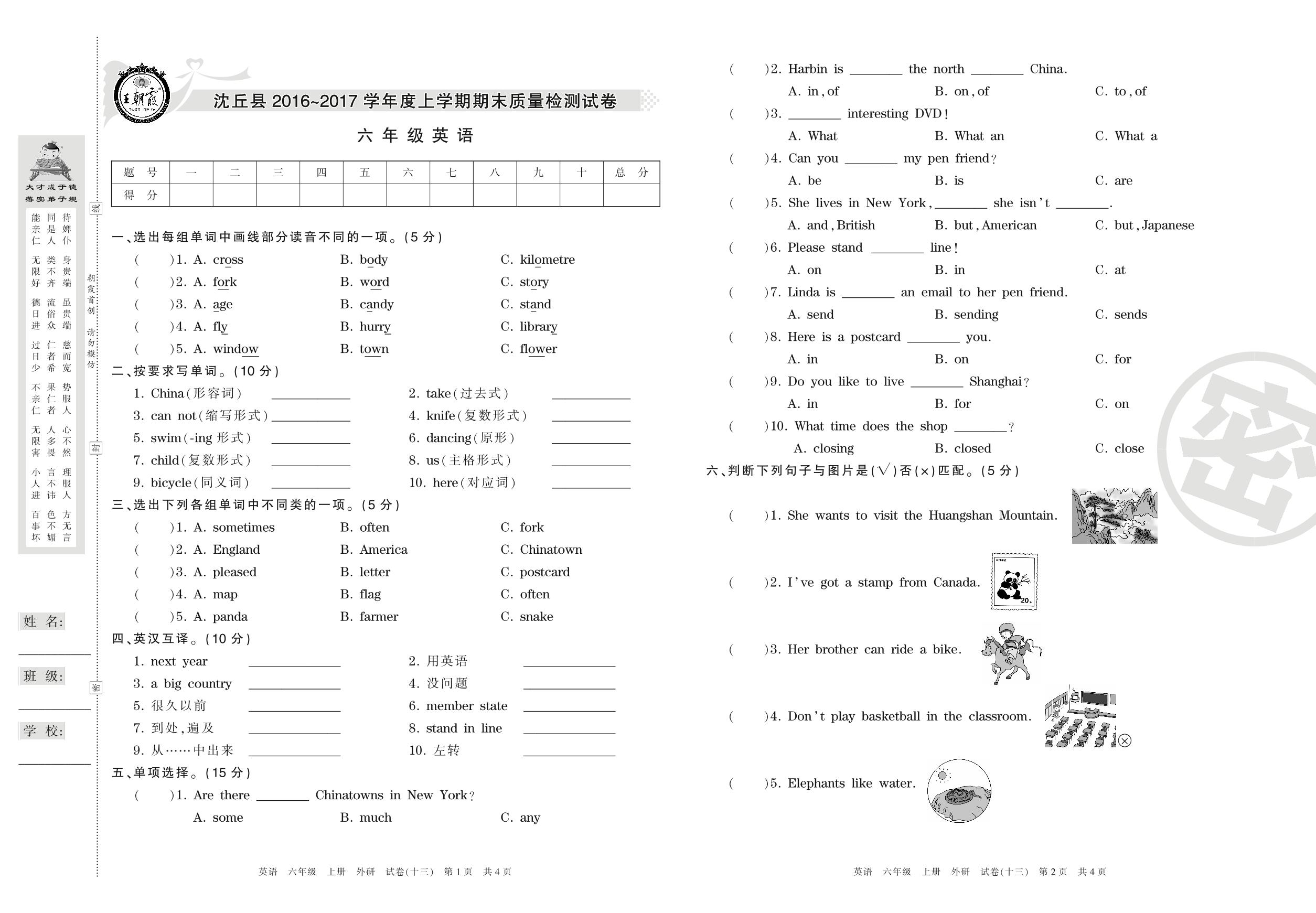 2016-2017学年第一学期周口市沈丘县六年级英语试卷(外研版)【13】