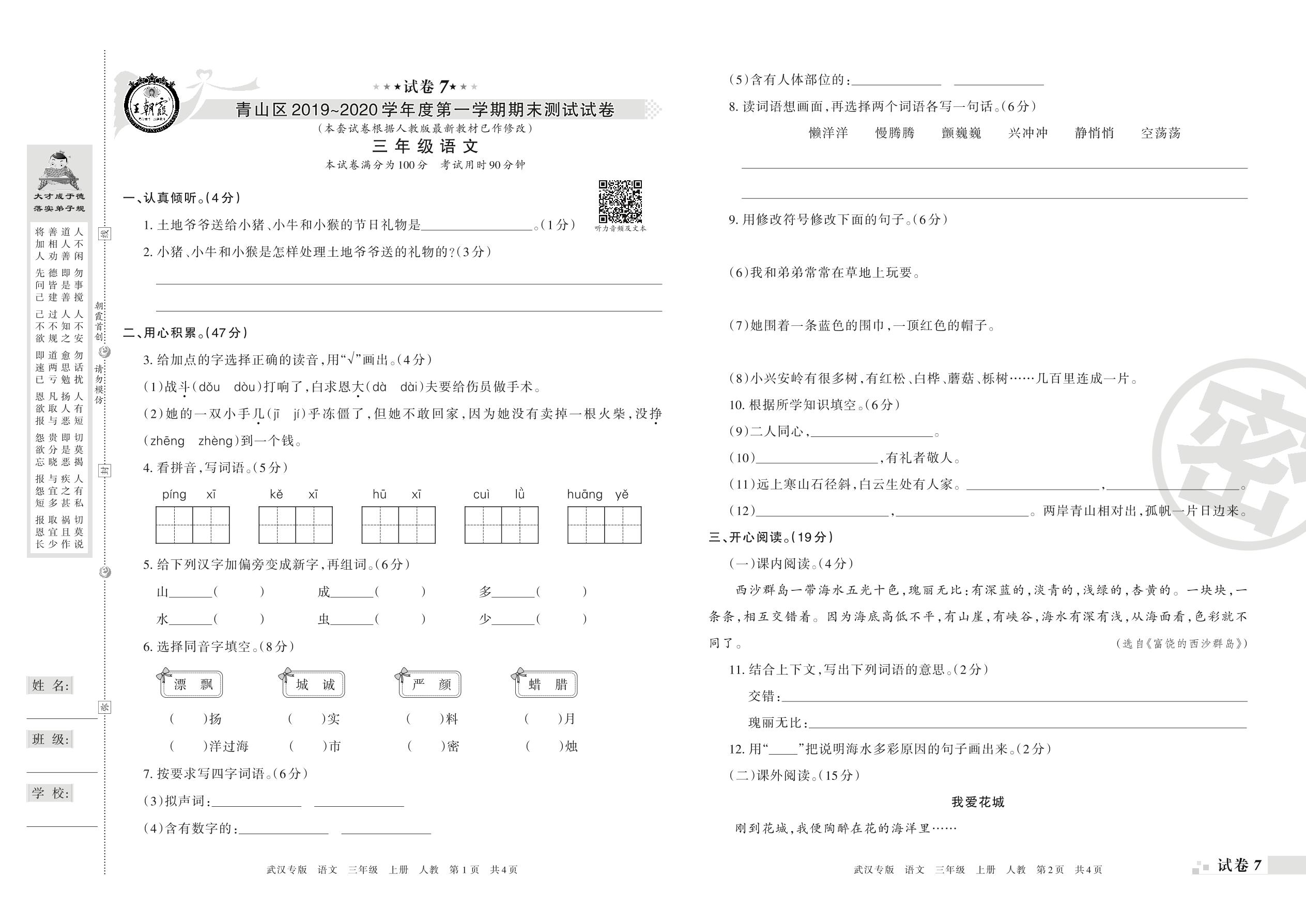 2019-2020学年第一学期武汉市青山区三年级语文试卷(人教版)【7】