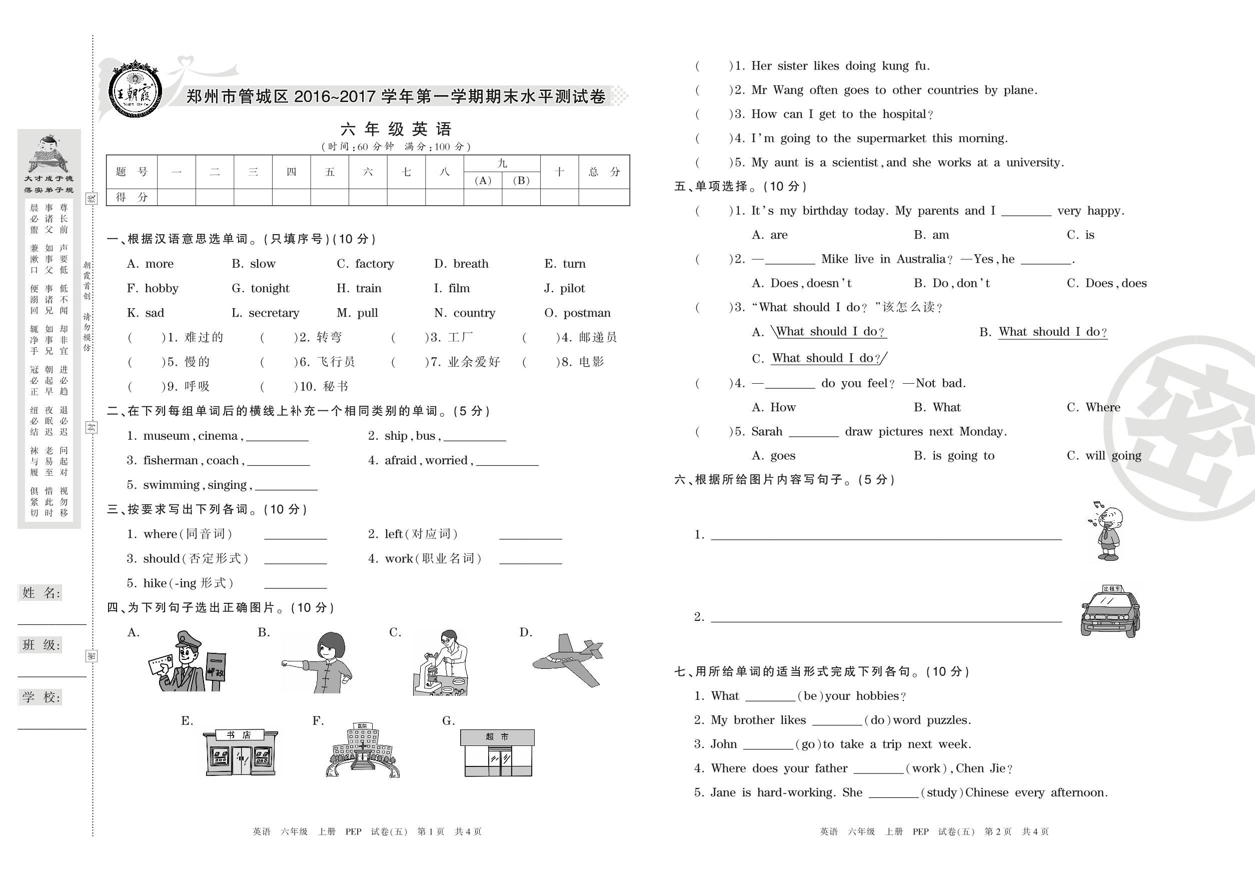 2016-2017学年第一学期郑州市管城区六年级英语试卷(PEP版)【5】