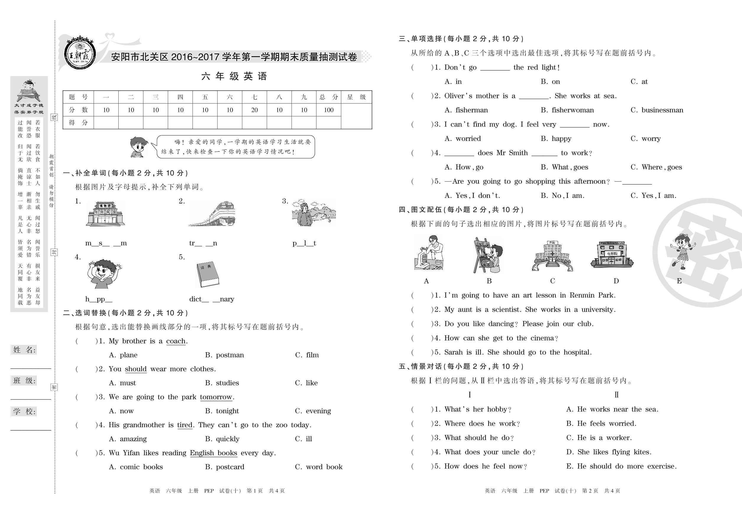 2016-2017学年第一学期安阳市北关区六年级英语试卷(PEP版)【10】