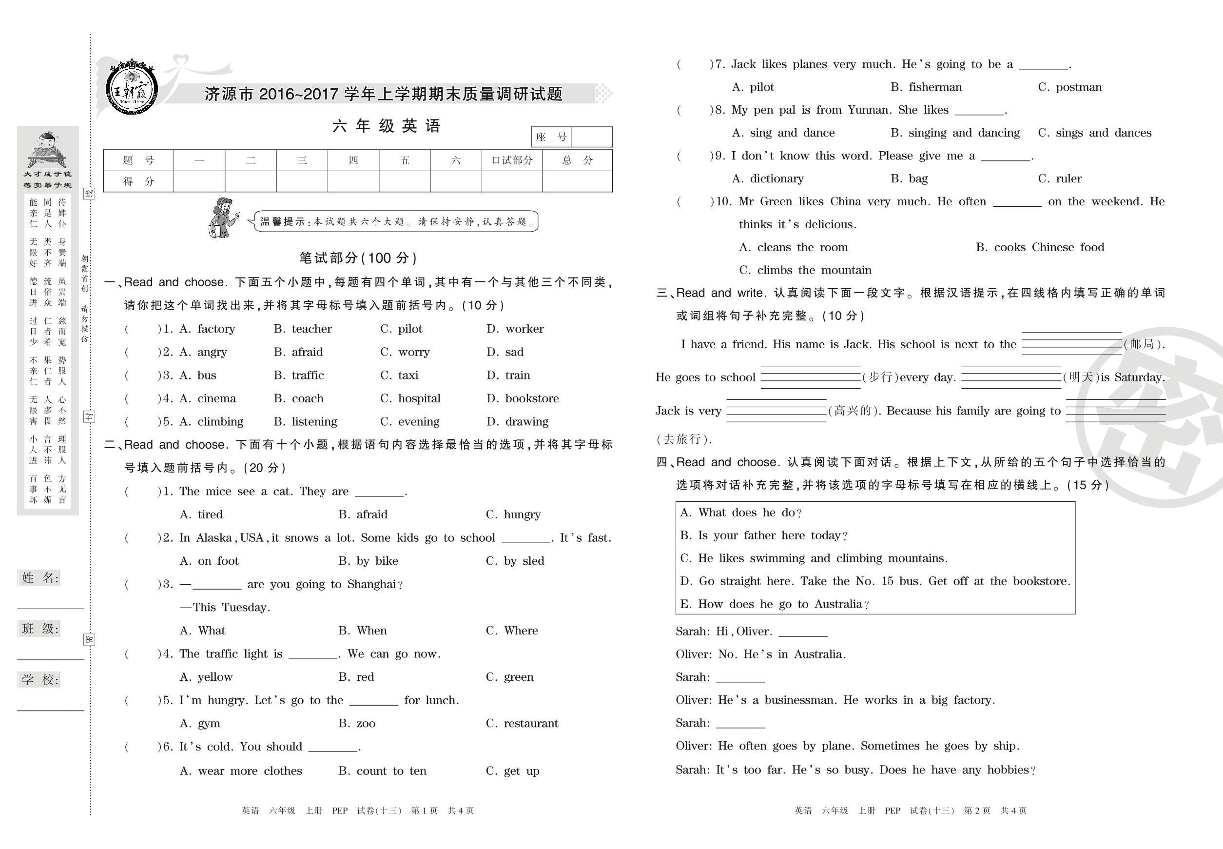2016-2017学年第一学期济源市六年级英语试卷(PEP版)【13】
