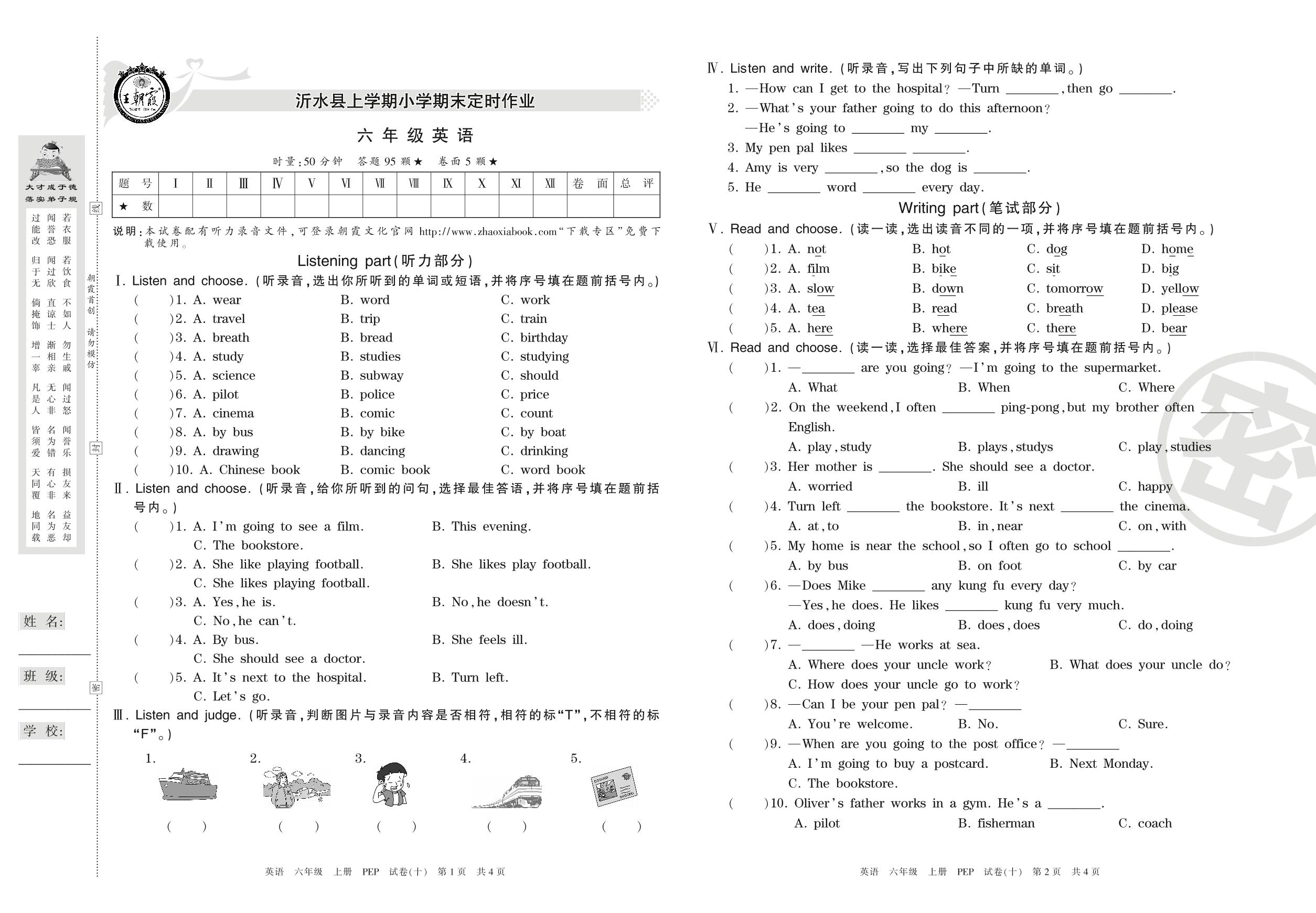 2016-2017学年第一学期临沂市沂水县六年级英语试卷(PEP版)【10】