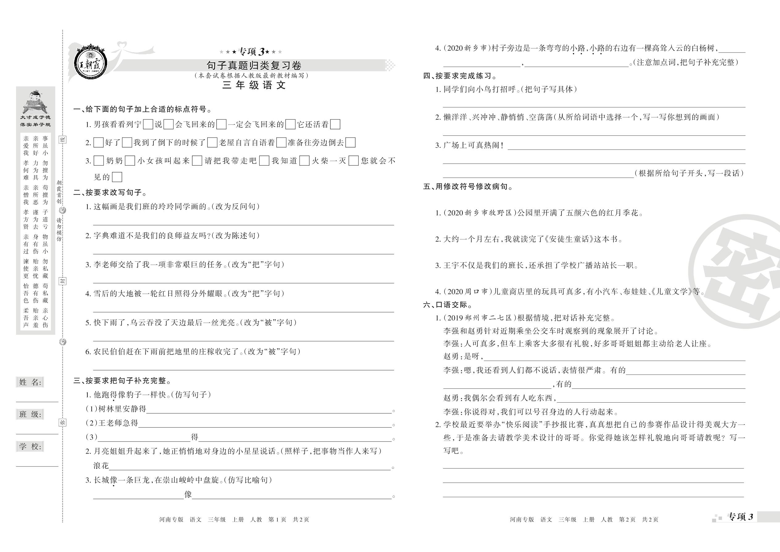 王朝霞期末专项卷——句子、课文内容与积累运用真题归类复习三年级上册语文(人教版)【0】