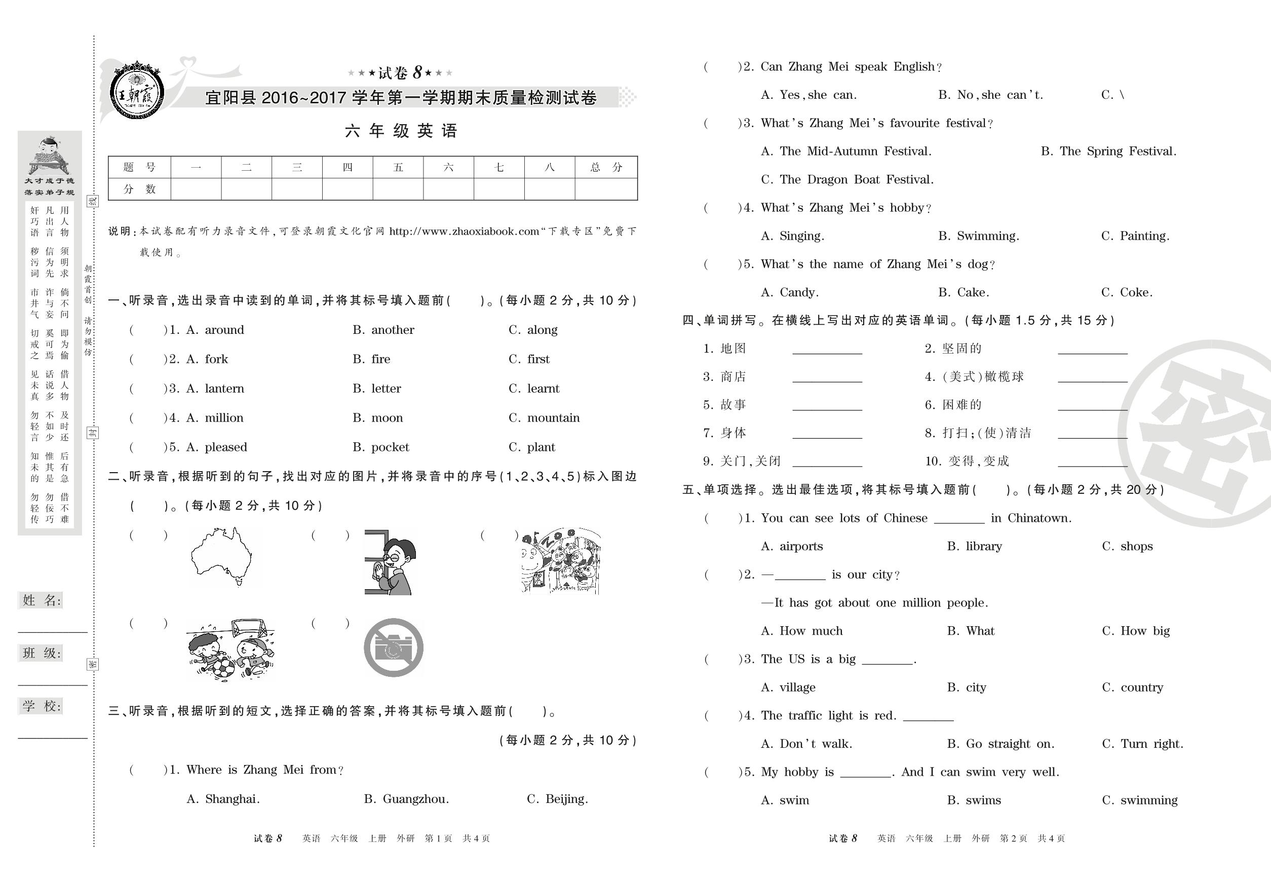 2016-2017学年第一学期洛阳市宜阳县六年级英语试卷(外研版)【8】
