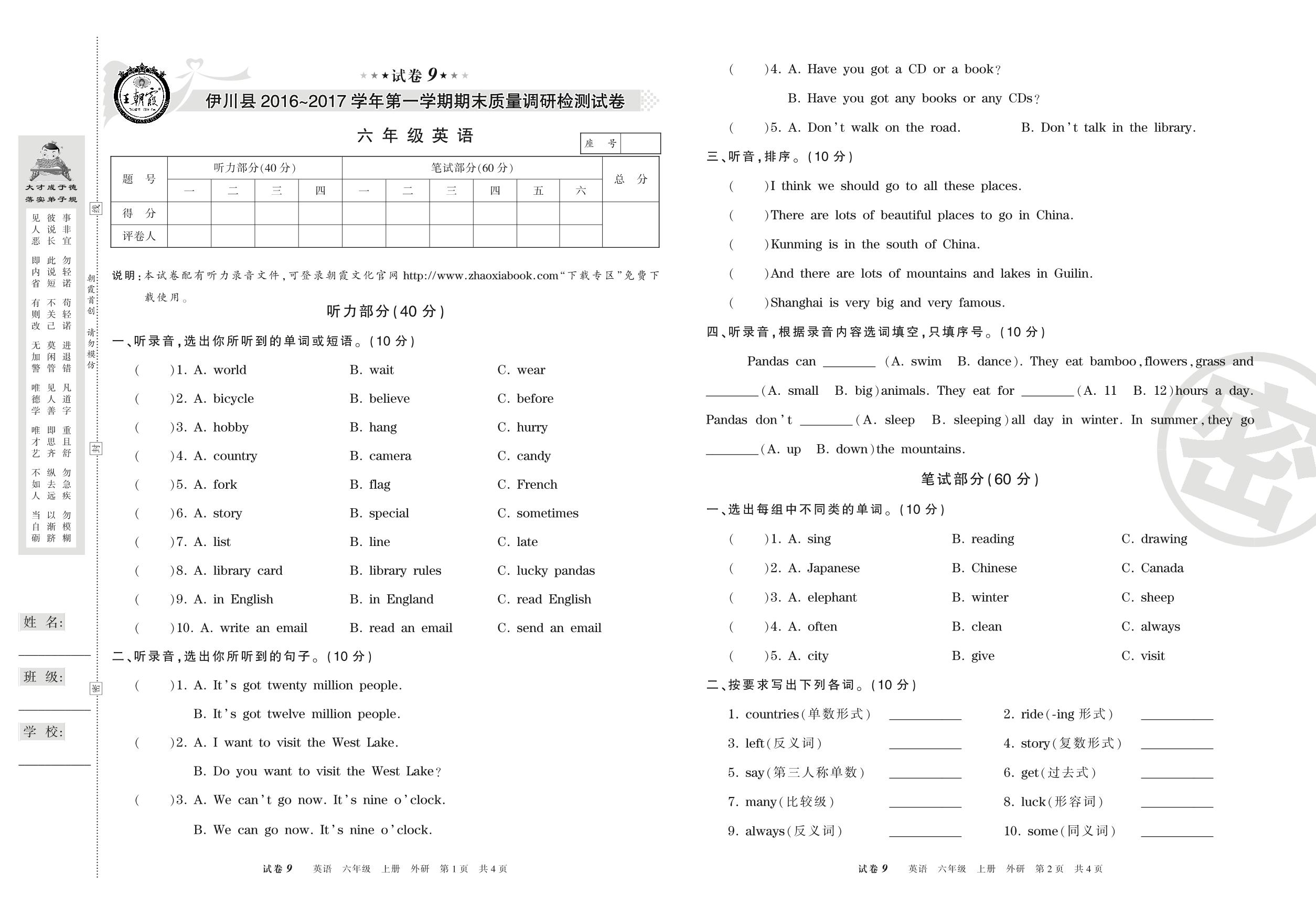 2016-2017学年第一学期洛阳市伊川县六年级英语试卷(外研版)【9】