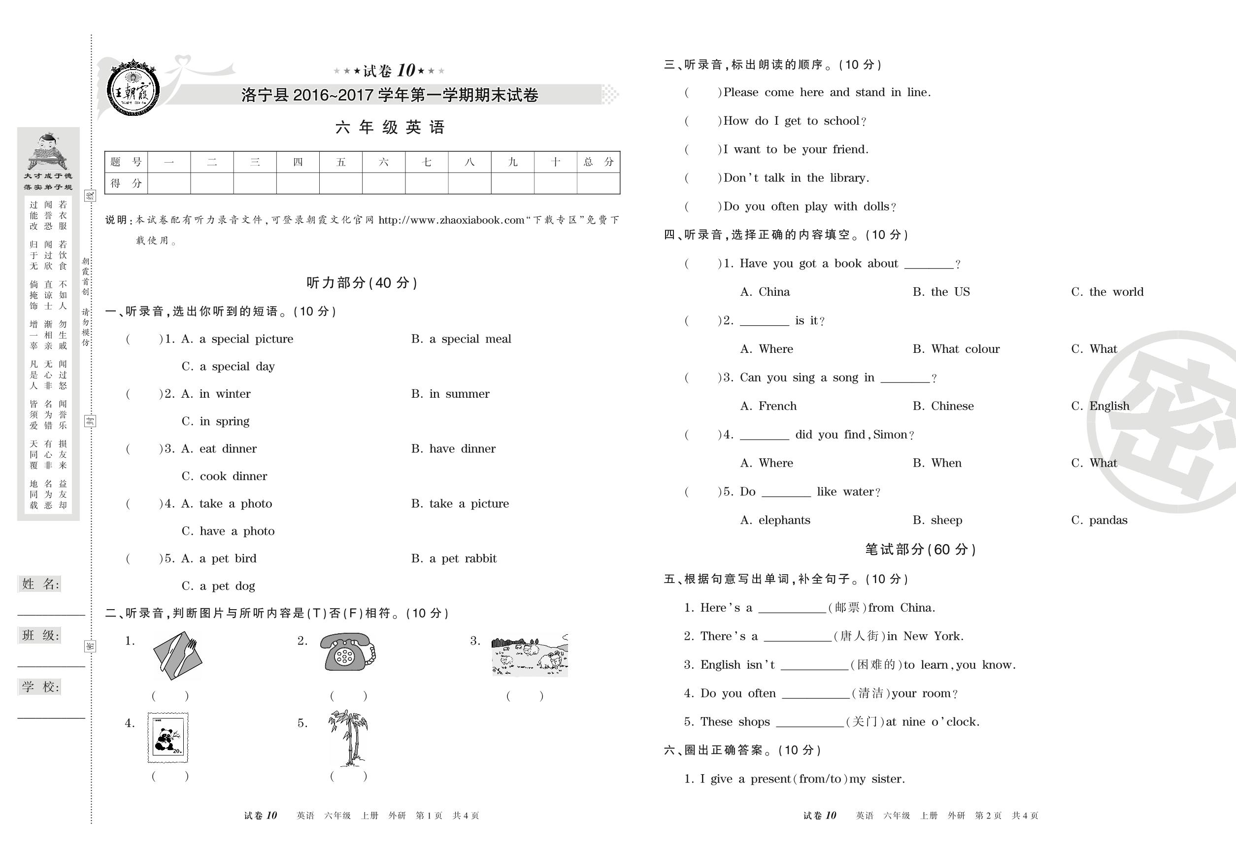 2016-2017学年第一学期洛阳市洛宁县六年级英语试卷(外研版)【10】
