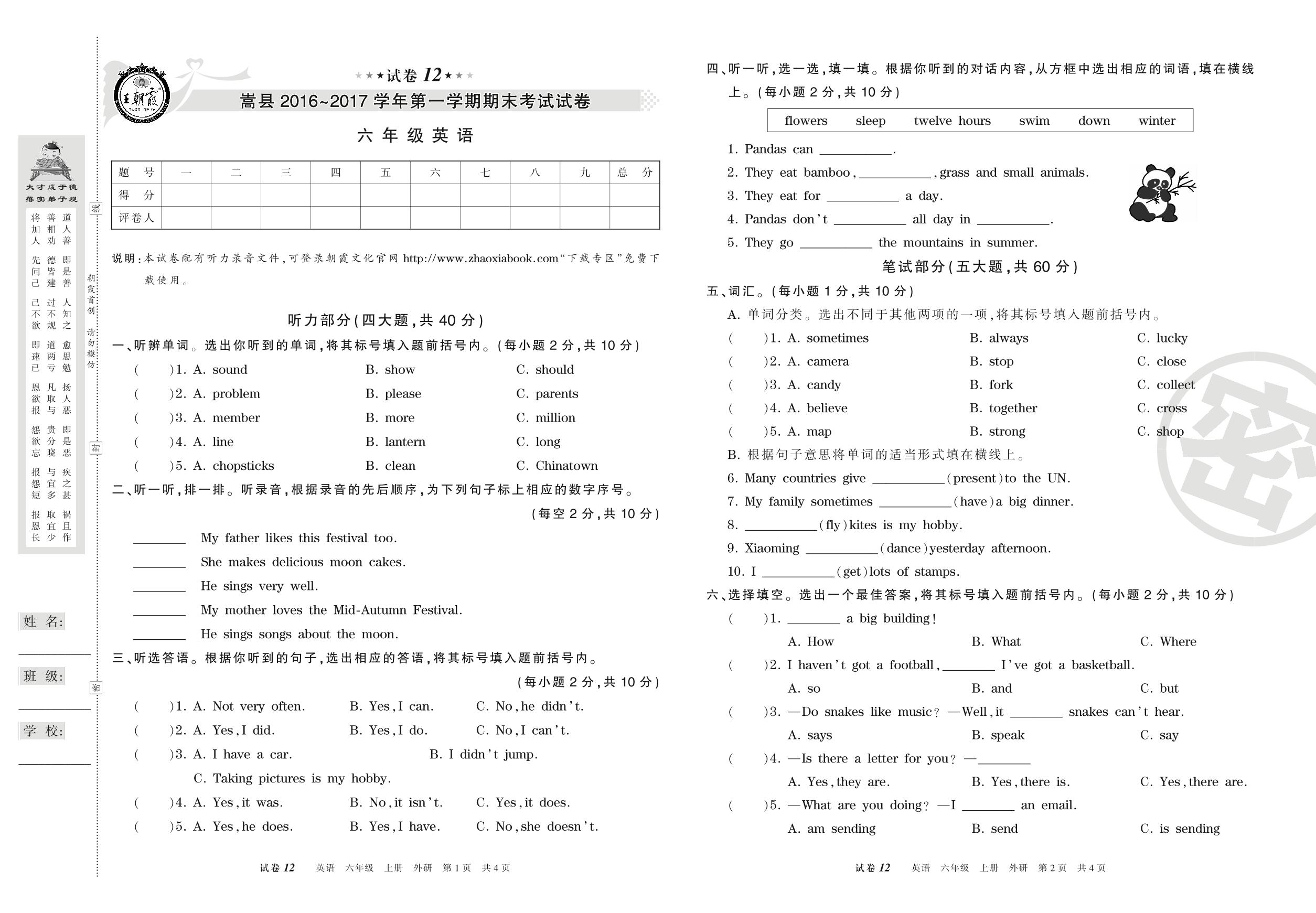 2016-2017学年第一学期洛阳市嵩县六年级英语试卷(外研版)【12】